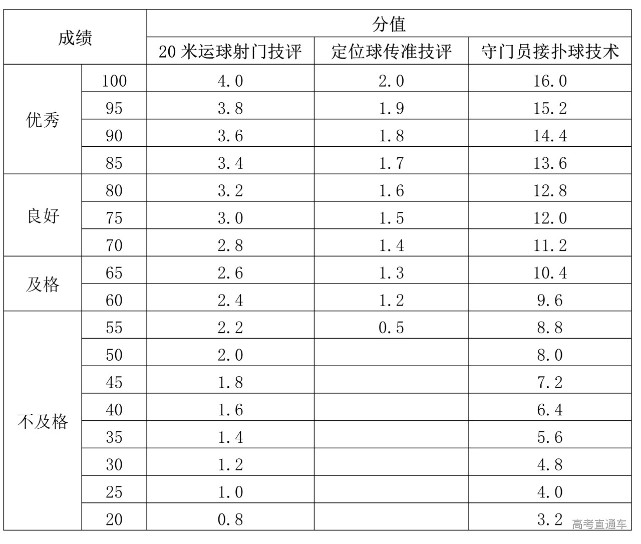 2.20米运球射门技评、定位球传准技评、守门加试定性评分表