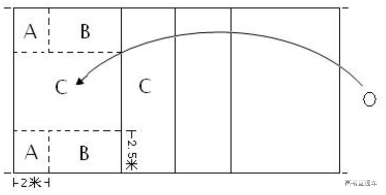 如图所示。考生在发球区用上手、勾手发球或跳发球10次,要求所发出的球有一定的速度和力量,对飞行速度慢、力量小的发球,则在相应得分中扣去0.3分