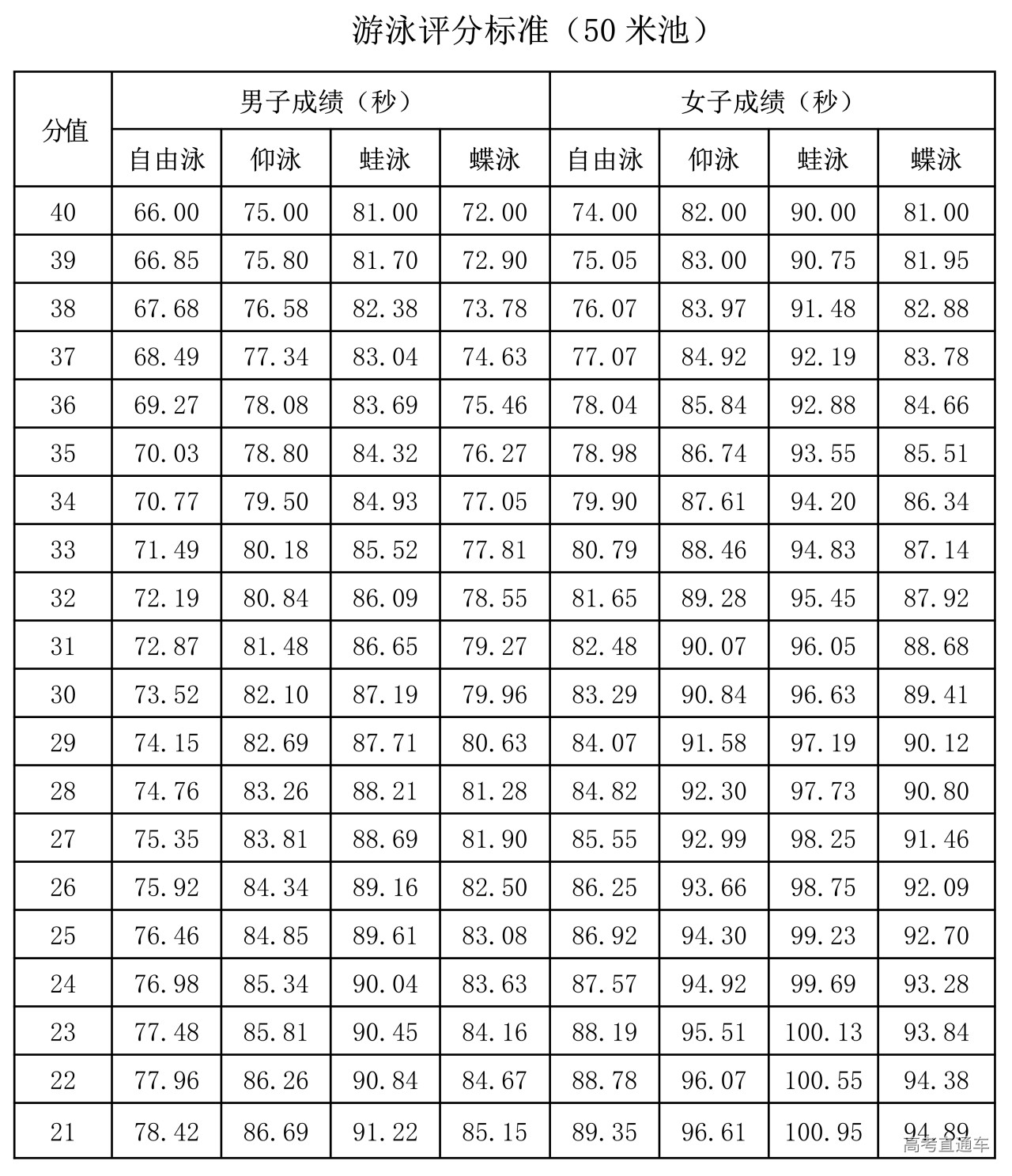 (一)100米跑素质考试评分表