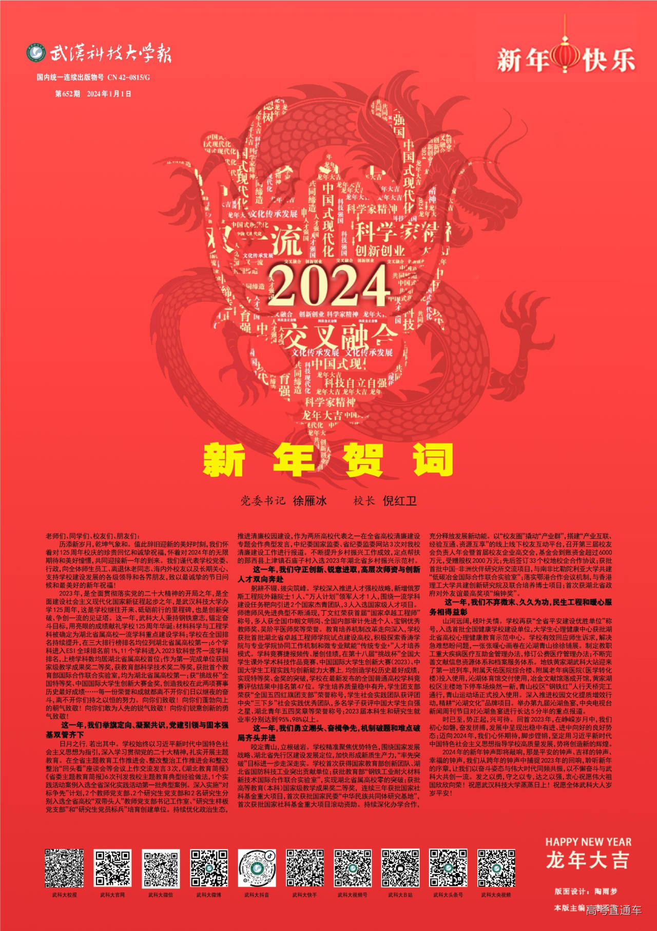 历添新岁月,乾坤气象和。值此辞旧迎新的美好时刻,我们怀着对125周年校庆的珍贵回忆和诚挚祝福,怀着对2024年的无限期待和美好憧憬,共同迎接新一年的到来。我们谨代表学校党委、行政,向全体师生员工、离退休老同志、海内外校友以及长期关心、支持学校建设发展的各级领导和各界朋友,致以最诚挚的节日问候和最美好的新年祝福!