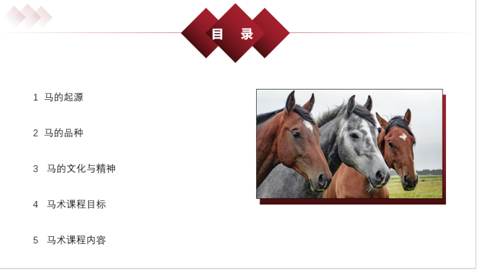 马术是为数不多的,能和大自然接触、又能和动物亲密接触的,同时实现这两个功能的一项运动。它融入更多的是人与马的相互尊重、和平和善和谐的相处。