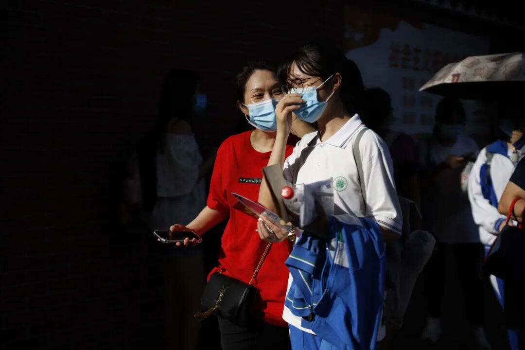 广州市第七中学考场外,家长和结束数学考试的考生交流。