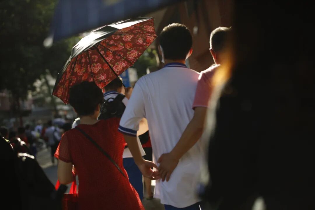 广州市第七中学考场外,家长为出场考生撑伞。南都记者 钟锐钧 摄