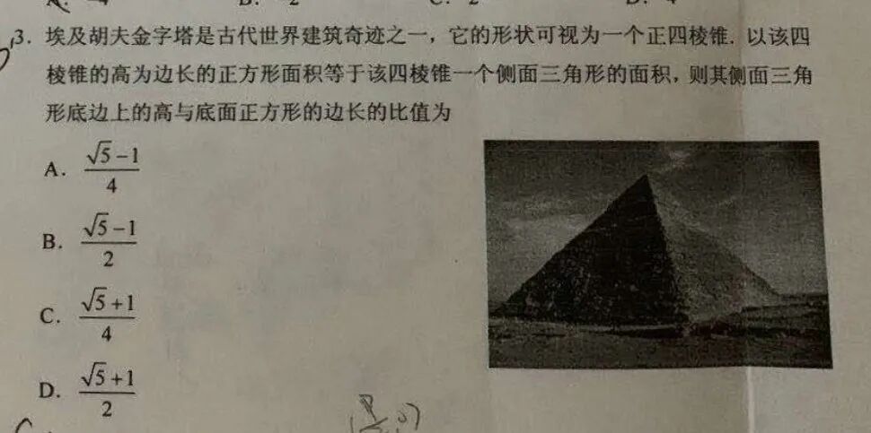 在广州市第七中学考场外,理科考生姚同学觉得,高考数学的选择题和填空题比较简单,很快就写完,而立体几何就有难度。选择题第三题比较新颖,考了金字塔,“就和去年求断臂维纳斯身高的题型差不多,题目给了一个立体金字塔的图,求金字塔侧面高和边长的比值。”同考场的理科考生王同学说,这次数学题都比较常规,发挥还可以,而第三题选择题就有点小心思。“金字塔”这题跟去年“断臂维纳斯”的考法差不多,平时有练习也能做出来。