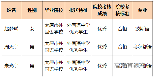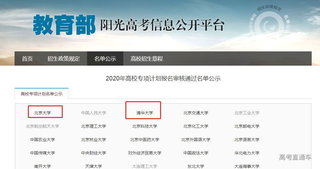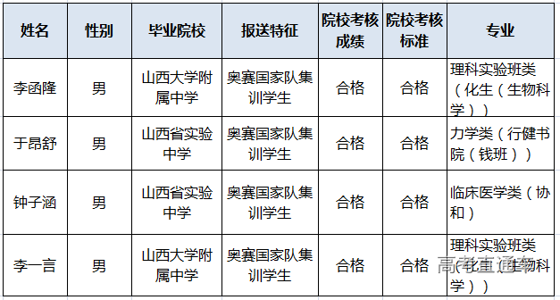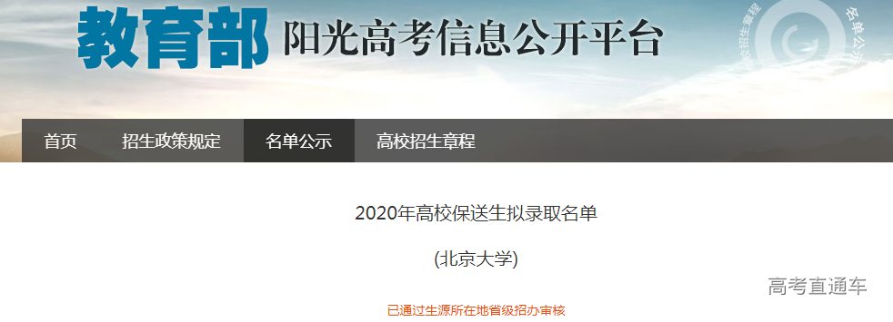2020年高校专项计划 报名审核通过名单公示(山西) 北京大学 王柄义 男 离石区江阴高级中学 闫雨涵 男 吕梁学院附属高级中学 高闯 男 离石区江阴高级中学 贺子龙 男 临县高级中学 侯成远 男 吕梁市高级中学 顾晋荣 男 繁峙县砂河镇砂河中学 王文翔 男 柳林县联盛中学 郝璐璐 女 临县一中 崔嘉保 男 沁水县沁水中学 高校专项计划,又称农村学生单独招生,是国家为更好地促进教育公平、让更多的农村学生上大学而出台的一项优惠政策。高校专项计划定向招收边远、贫困、民族等地区县(含县级市)以下高中勤奋好学、成绩优良的农村学生。 2020年高校保送生拟录取名单(北京大学) 高校保送生北京大学拟录取的 太原各校学生名单 2020年高校保送生拟录取名单(清华大学) 高校保送生清华大学拟录取的 各校学生名单 甄子豪,男,晋城一中(同上)计算机类