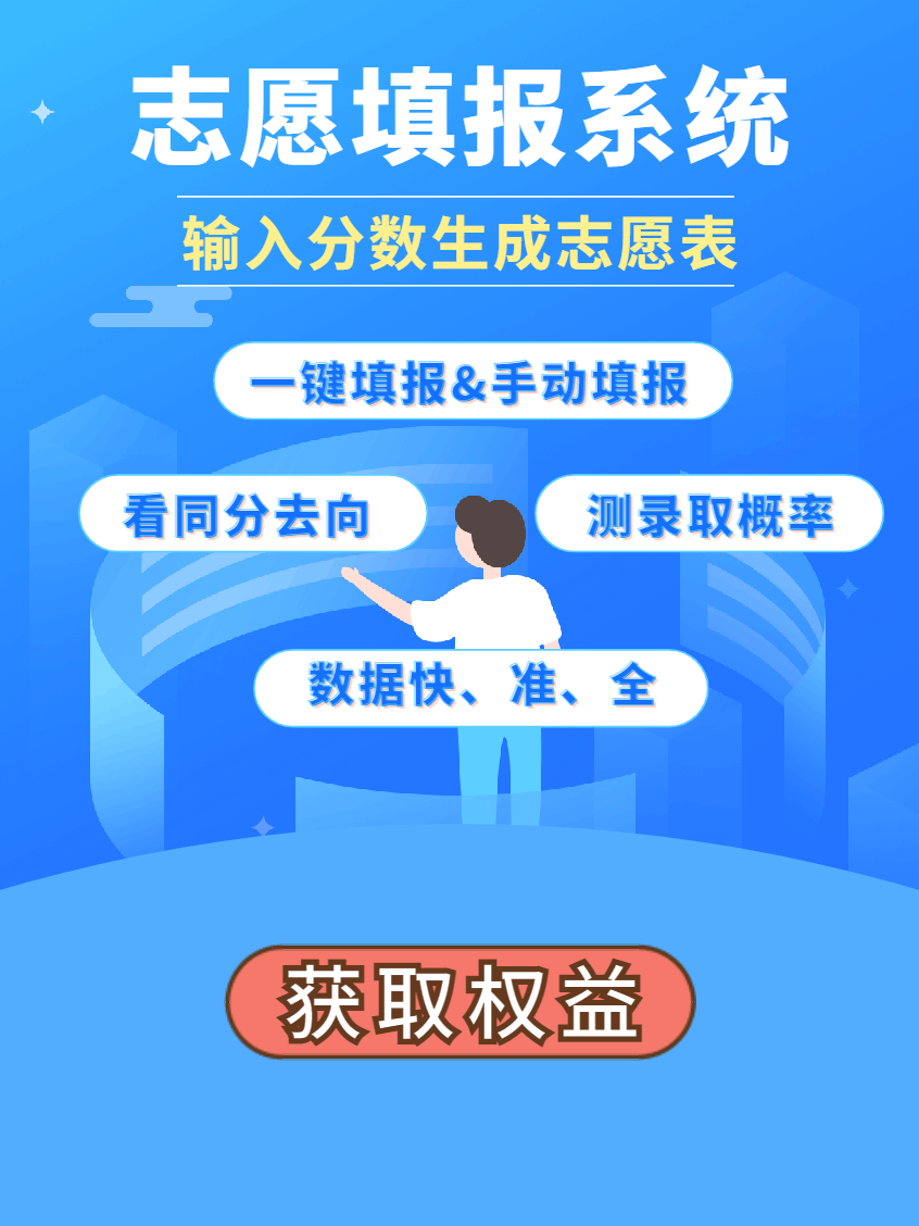 输成绩,结合你的个性化需求如院校性质、专业等条件,智能匹配目标院校。一键生成志愿表,志愿选择不再困难。