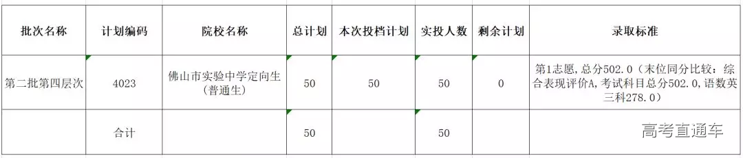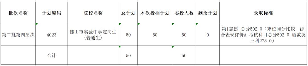 第四层次,佛山市实验中学定向生(普通生),其最低录取控制分数线487分。