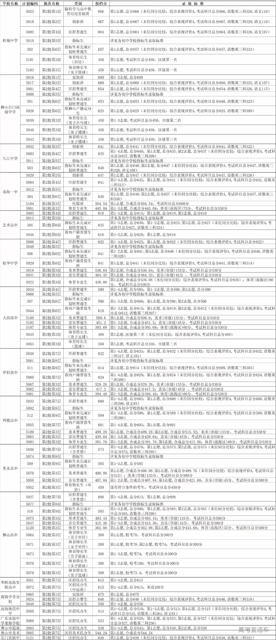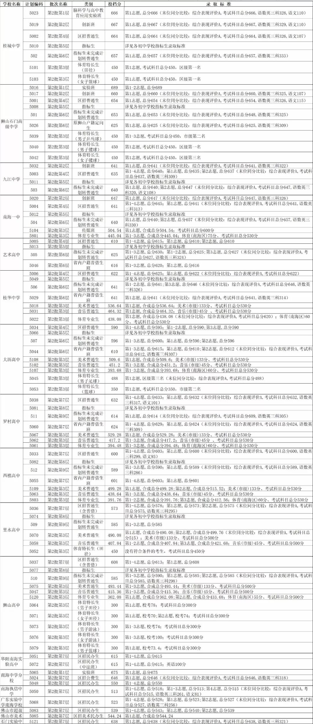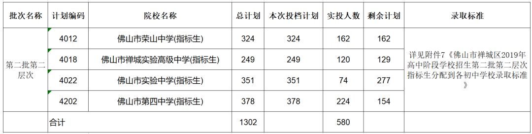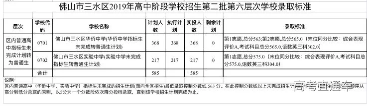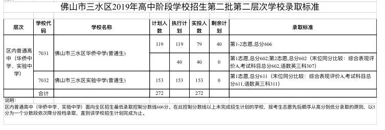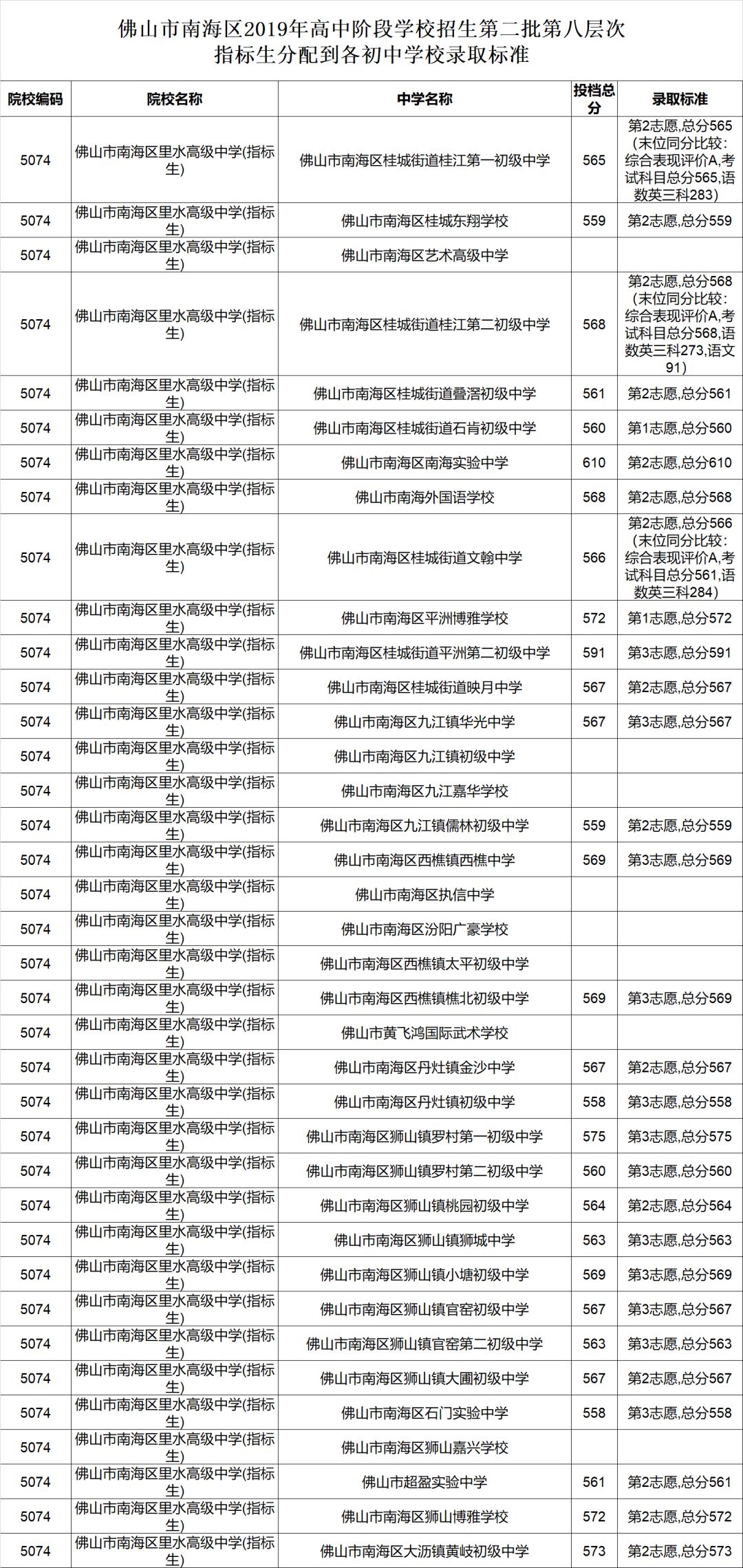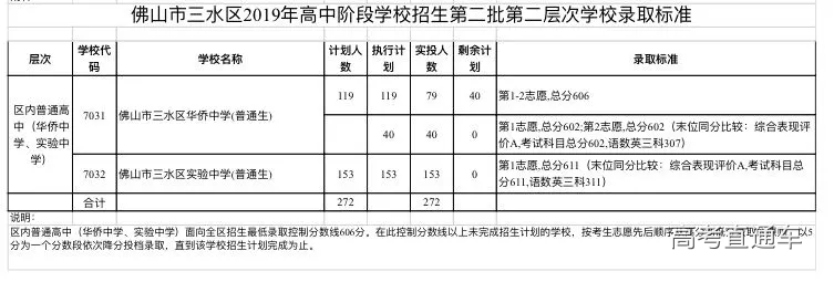 南海区2019年高中阶段学校招生第二批招生学校各层次的投档分数线和录取标准如下: