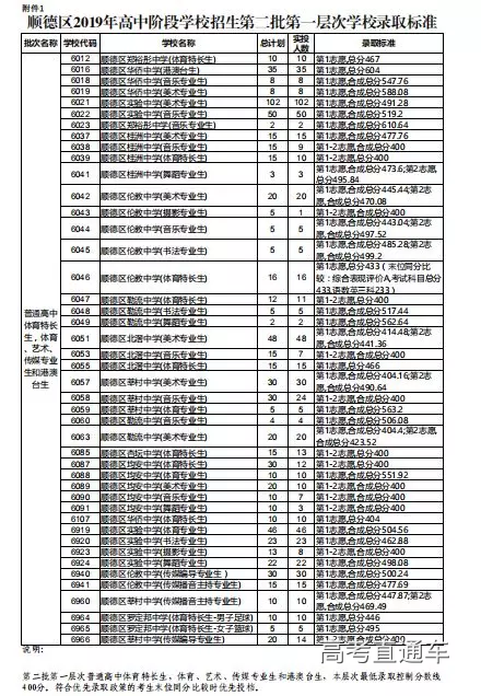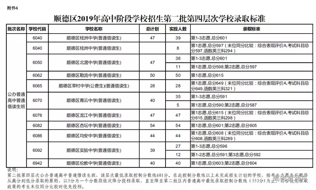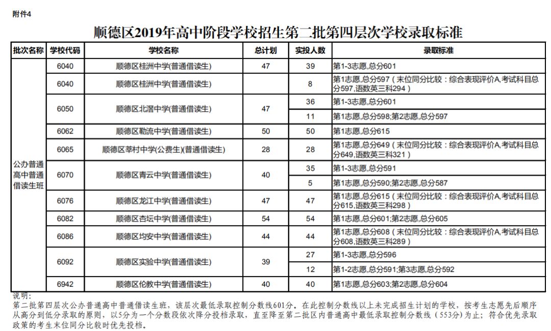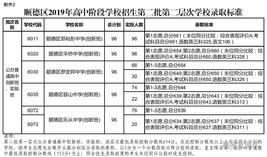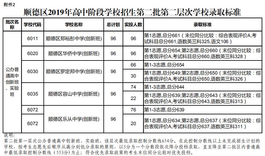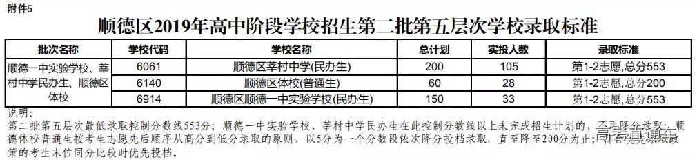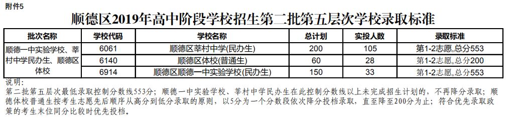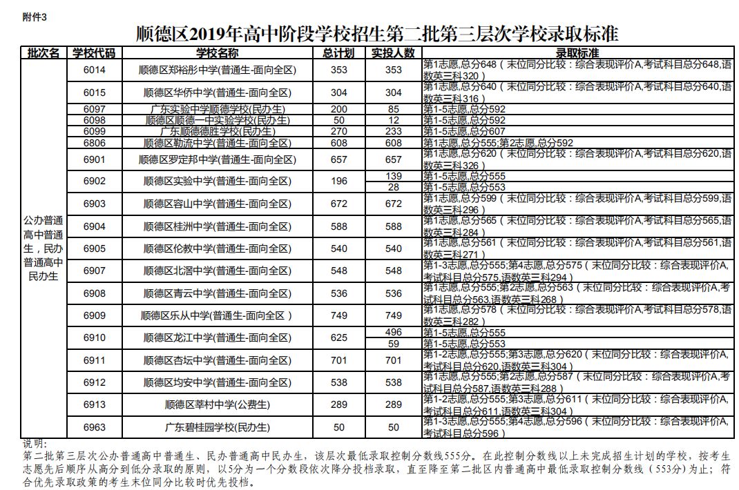 根据顺德区教育局《关于印发顺德区 2019 年高中阶段学校招生考试工作意见的通知》(顺教[2019]28 号)精神,确定第二批普通高中普通生最低录取控制线为 553 分。