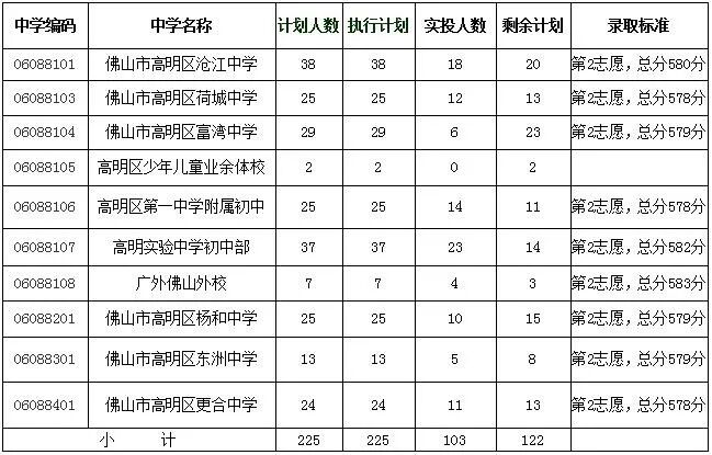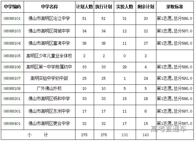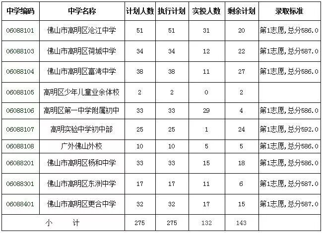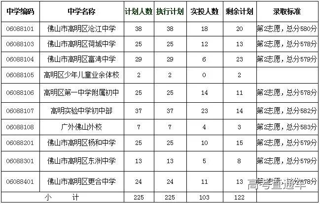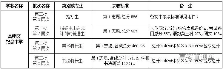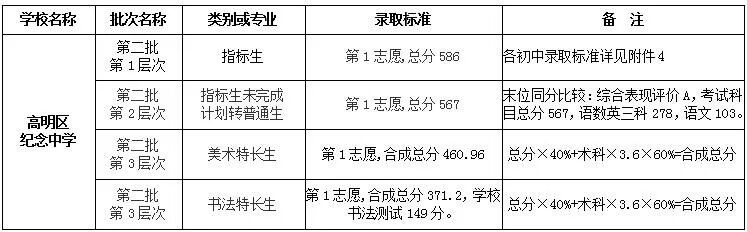 高明区纪念中学指标生分配到各初中学校录取标准: