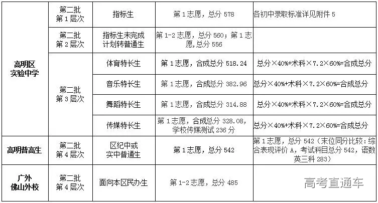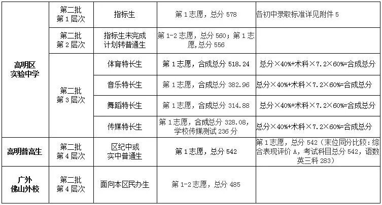 在第二批的各层次中,高明区纪念中学、高明实验中学进行了指标生、指标生未完成转普通生、体艺特长生、高明普高生的录取;广外附设佛山外国语学校进行了面向高明区民办生的录取;高明区职业技术学校和区高级技校进行了中高职三二分段高职班、高级技工班的录取。