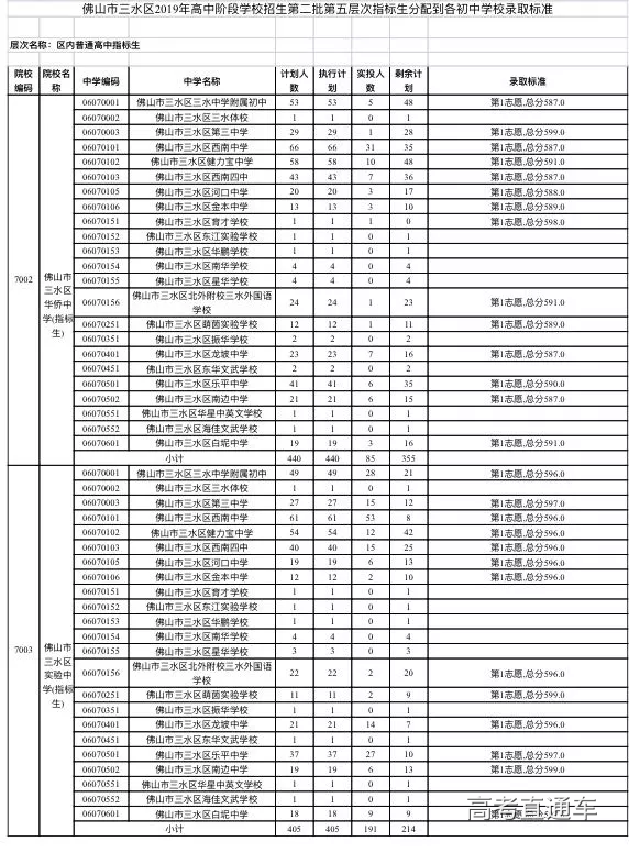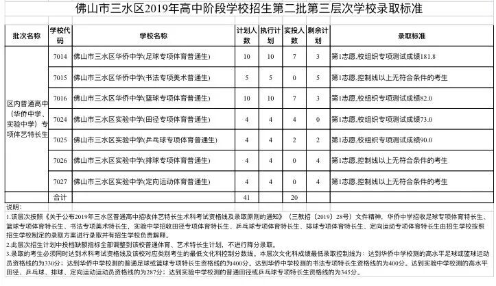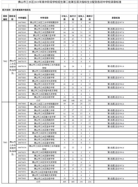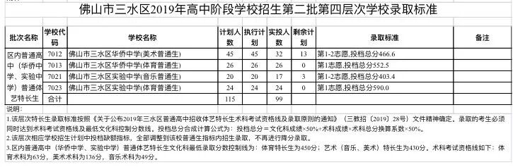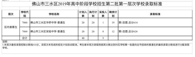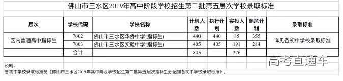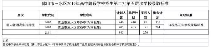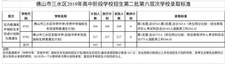2019年佛山市三水区高中阶段学校招生第二批最低录取控制分数线及学校录取标准如下: