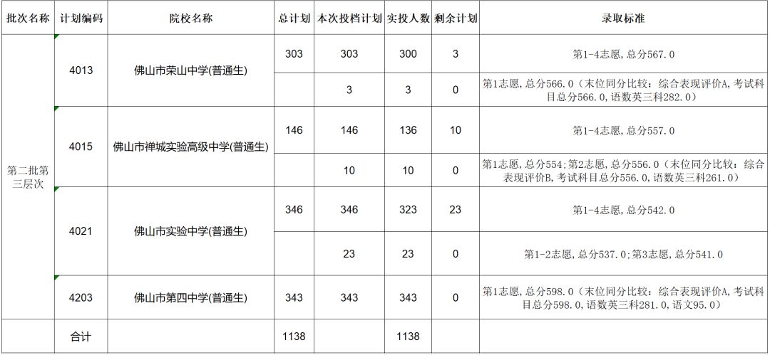 第三层次,佛山四中等4所学校普通生面向本区招生,其最低录取控制分数线582分。在此分数线之上,部分学校的招生计划未完成,根据考生志愿的先后顺序从高分到低分录取的原则,以5分为一个分数段依次降分投档,直到该学校招生计划完成为止。