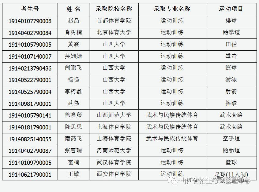 山西省2019年普通高校招生高水平运动员保送录取名单