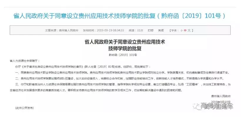2019年9月19日,省政府网站发布消息,经研究贵州省人民政府批复同意贵州应用技术职业学院设立贵州应用技术技师学院。贵州应用技术职业学院成为贵州省首家申办技师学院的民办高职院校,开创了贵州省民办高职院校“双挂牌”的先例。贵州应用技术技师学院和贵州应用技术职业学院相对独立办学,学院隶属关系、机构编制事项及经费拨付渠道不变。