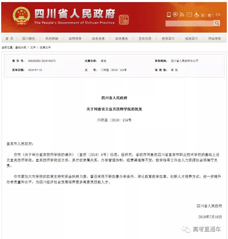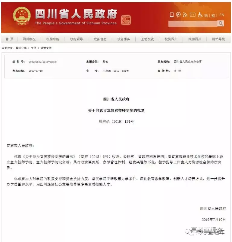 2019年7月12日,四川省人民政府网站发布了《四川省人民政府关于同意设立宜宾技师学院的批复》,同意设立宜宾技师学院,具体如下: