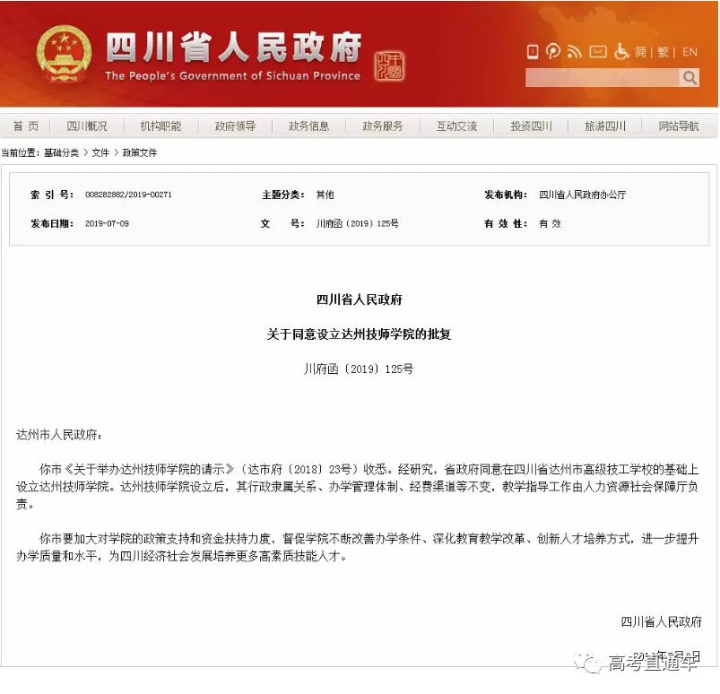 2019年7月9日,四川省人民政府网站发布了《四川省人民政府关于同意设立达州技师学院的批复》: