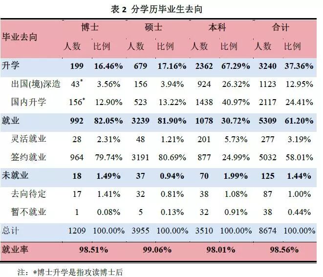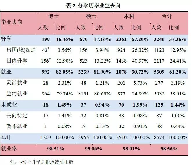 2018 年学校本科、硕士和博士毕业生的就业率均达到98%以上,分别为98.01%、99.06%和98.51%。按学历层次统计,本科生签约就业比例为24.99%,国内升学比例为40.97%,出国(境)深造比例为26.32%,灵活就业比例为5.73% ;硕士生签约就业比例为80.69%,,国内升学比例为13.22%,出国(境)深造比例为3.94%,灵活就业比例为1.21%;博士生签约就业比例为79.74%,国内升学比例为12.90%,出国(境)深造比例为3.56%,灵活就业比例为2.31%
