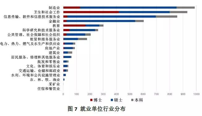 从就业单位所属行业来看,学校毕业生就业最多的三个行业分别为:制造业、卫生和社会工作以及信息传输、软件和信息技术服务业。博士生到卫生和社会工作就业的比例最高,硕士生到制造业就业的比例最高,本科生到信息传输、软件和信息技术服务业就业的比例最高。