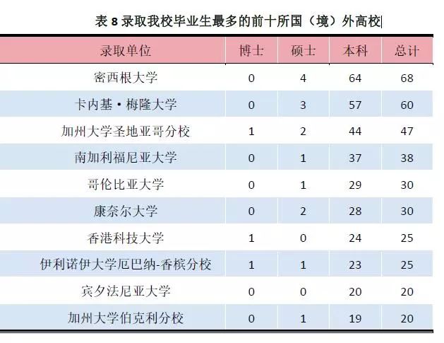 录取毕业生排前三位的国(境)外高校分别是密西根大学(Universityof Michigan)、卡内基梅隆大学(Carnegie Mellon University)和加州大学圣地亚哥分校(University of California, San Diego)。