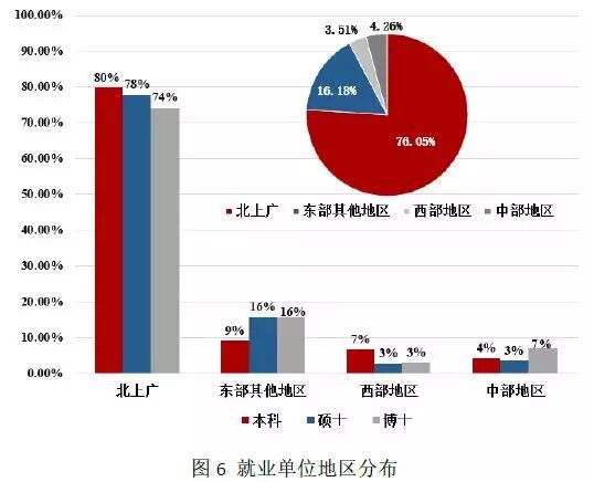 从就业地域来看,学校毕业生主要就业省市为上海市。博士生、硕士生和本科生就业人数分别为623 人、2325 人和589 人。除上海市外,毕业生就业人数较多的省市依次有:广东省、浙江省、江苏省和北京市。毕业生总体更倾向于在东部地区就业。