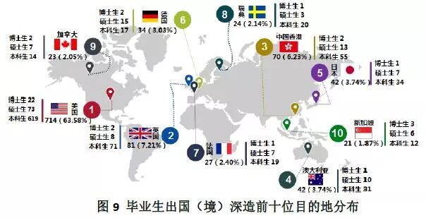 学校有63.58%的毕业生选择美国高校,数量上远超过其他国家和地区。其他出国(境)深造目的地国家和地区依次为:英国(81 人)、中国香港(70 人)、澳大利亚(42 人)、日本(42 人)等