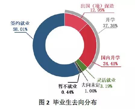 截至 2018 年10 月31 日, 学校2018 年毕业生就业率为98.56%。其中,签约就业比例为58.01%,国内升学比例为24.41%,出国(境)深造比例为12.95%,灵活就业比例为3.19%,暂不就业比例为0.44 %,去向待定比例为1%