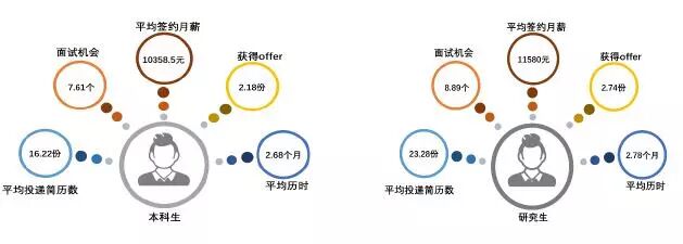 本科生在求职过程中平均投递简历16.22 份,获得7.61个面试机会,获得2.18 份offer,平均历时2.68 个月。研究生平均投递简历23.28份,获得8.89 个面试机会,获得 2.74 份offer,平均历时2.78 个月。