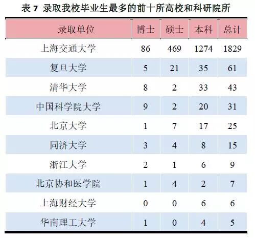除本校外,录取学校毕业生人数排前三位的高校和科研院所分别是复旦大学(61 人)、清华大学(43 人)、中国科学院大学(31 人)