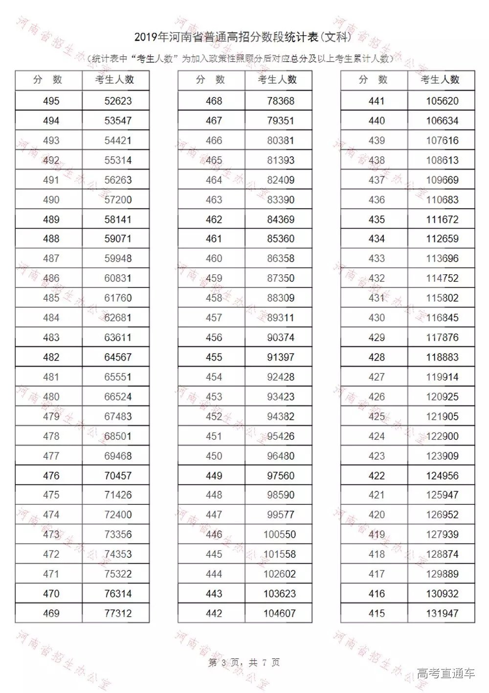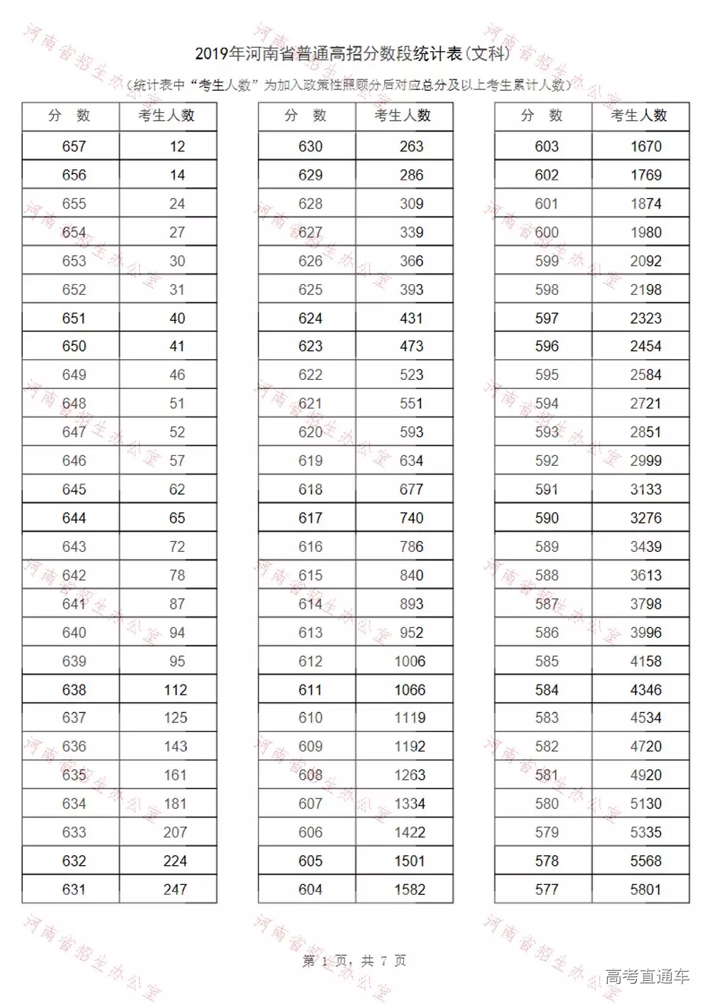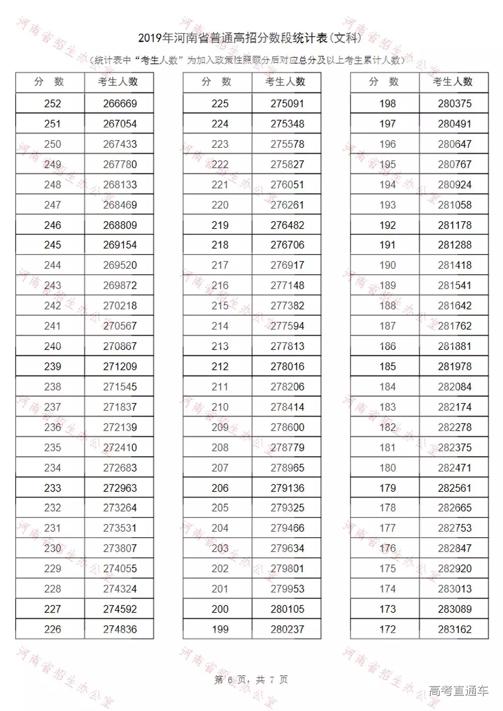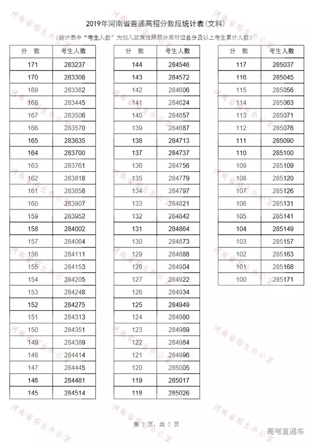 “一分一段”表内对每一个分数线上有多少考生、该分数线以上有多少考生进行了详细统计。普通文理科从100分起一分一段一公布,一直公布到最高分,其中的分数已经包含政策性照顾分。此外,专升本、对口生按专业、类别公布到最低控制分数线,以下的不再一分一段公布,艺术、体育类文化成绩排序包含在普通文理科中,不单独公布。