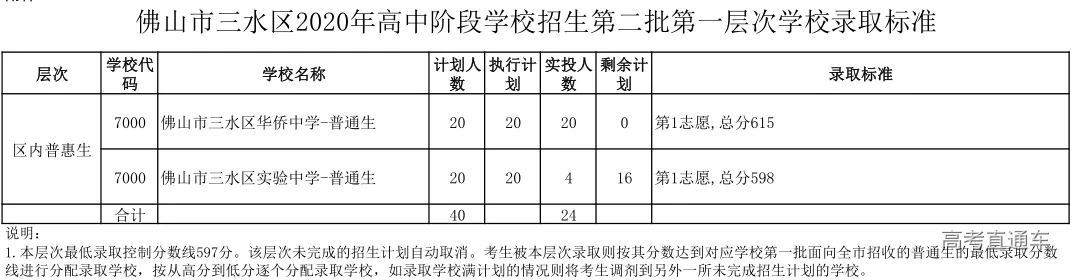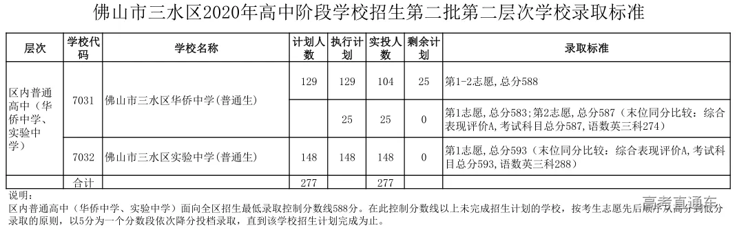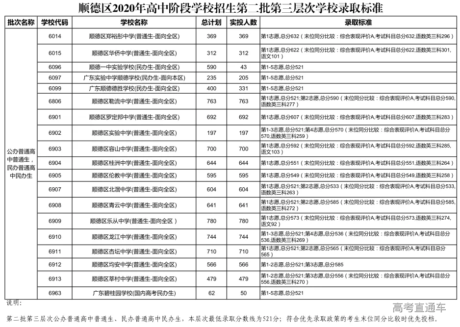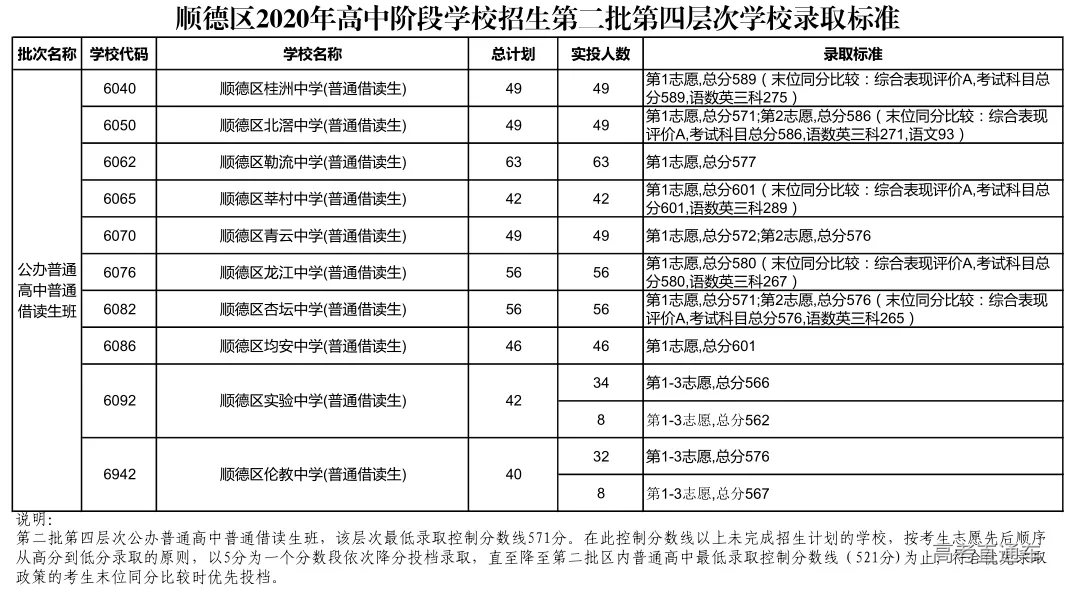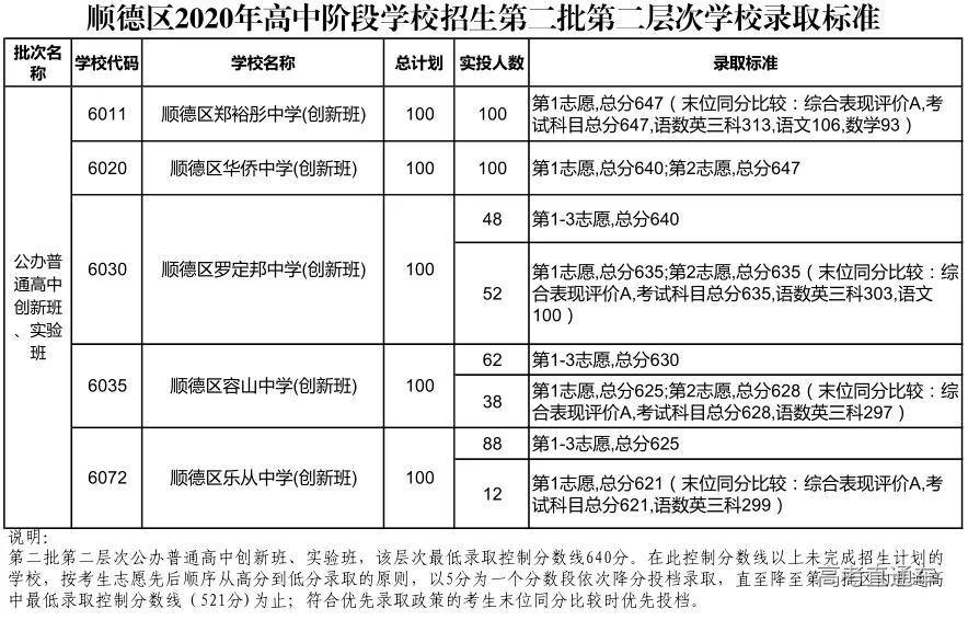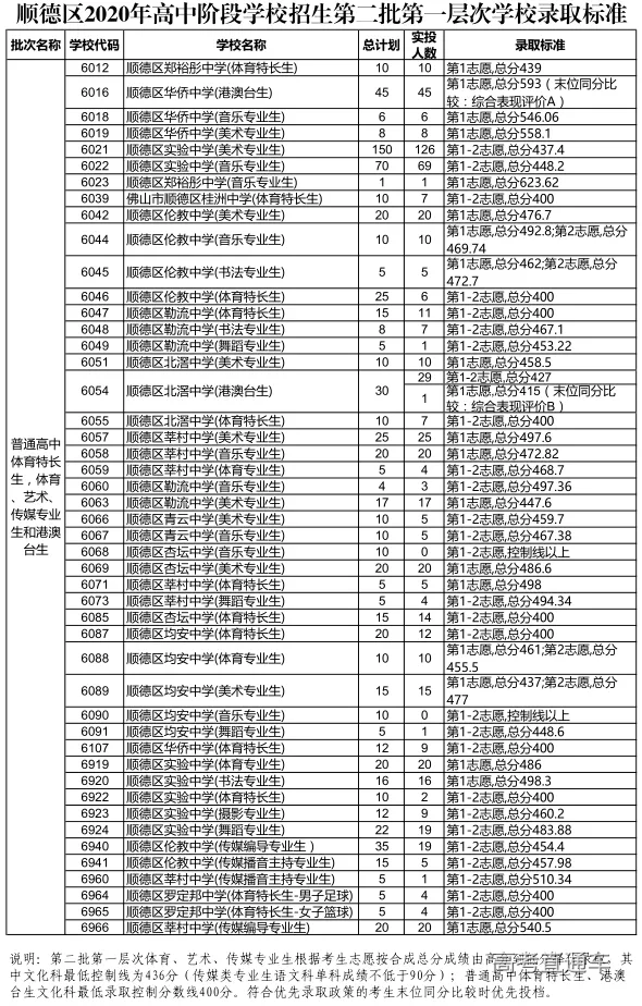 根据市的统一要求,顺德区2020年高中阶段学校招生第二批次录取采用佛山市中考录取系统进行划线投档,现将各层次最低录取控制分数线及各层次高中学校的录取标准公布如下: