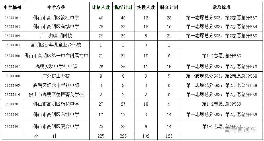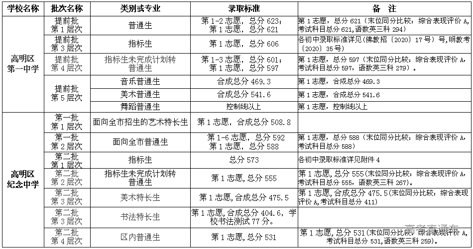 南海区2020年高中阶段学校招生提前批、第一批、第二批控制分数线及录取标准