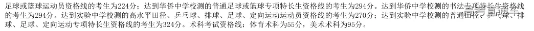 达到华侨中学校测的高水平足球或篮球运动员资格线的考生为224分;达到华侨中学校测的普通足球或篮球专项特长生资格线的考生为294分。达到华侨中学校测的书法专项特长生资格线的考生为294分。