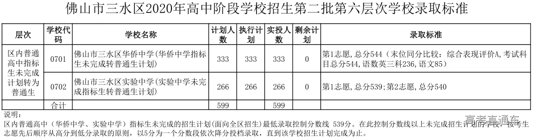 经研究,2020年佛山市三水区高中阶段学校招生第二批最低录取控制分数线及学校录取标准如下: