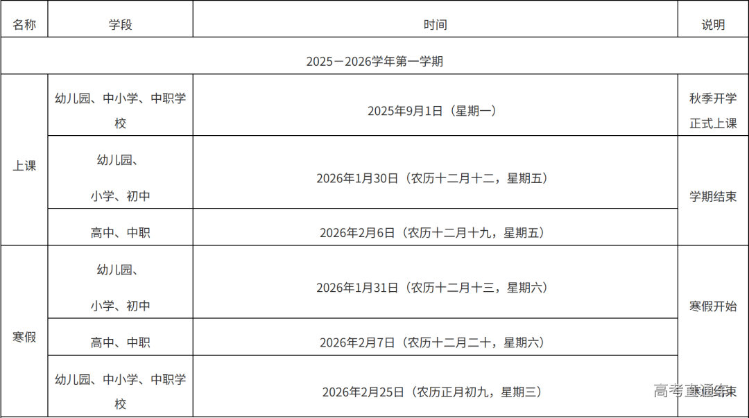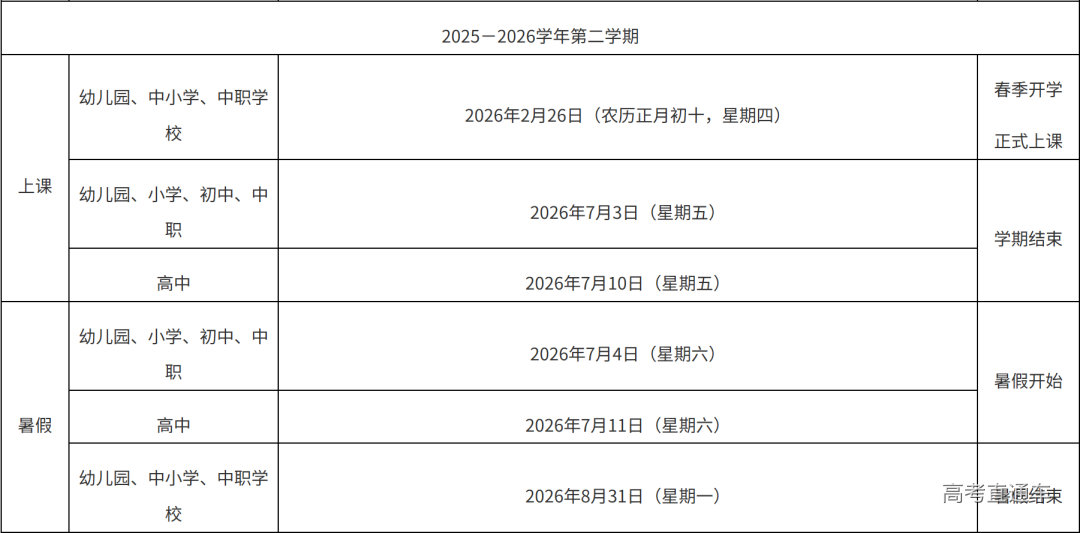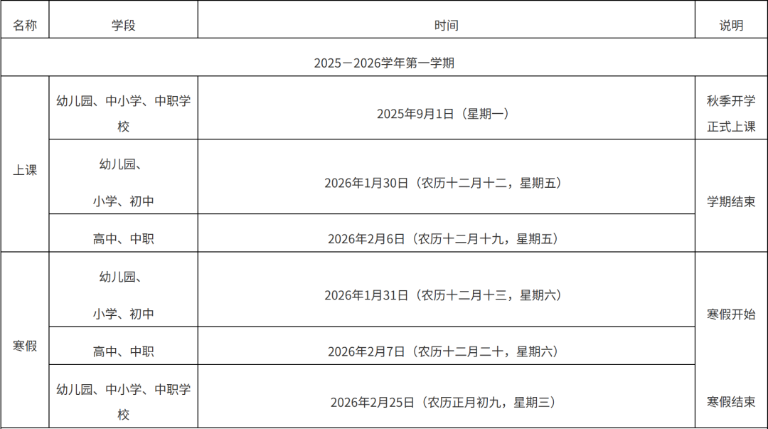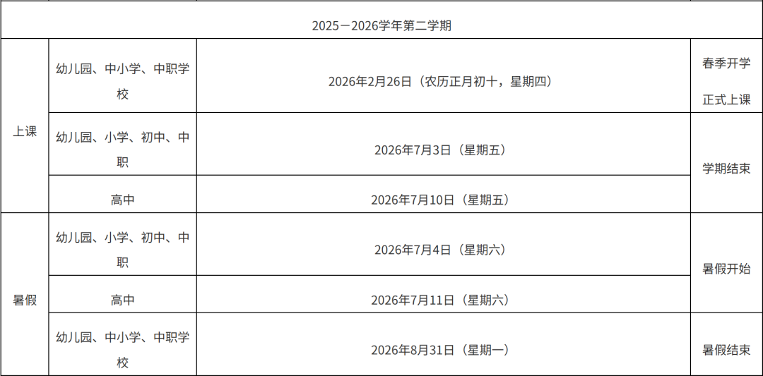 点击查看>>漳州市教育局办公室关于印发漳州市普通中学2025—2026学年校历的通知 龙岩市全日制普通中小学 2025—2026学年校历公布 小学、初中 第一学期:2025年8月31日(农历七月初九,星期日)开学注册,2025年9月1日(农历七月初十,星期一)正式上课。2026年2月6日(农历十二月十九,星期五)学期结束。2026年2月7日(农历十二月二十,星期六)至3月4日(农历正月十六,星期三)放寒假。 第二学期:2026年3月5日(农历正月十七,星期四)开学注册,2026年3月6日(农历正月十八,星期五)正式上课,2026年7月2日(农历五月十八,星期四)学期结束。2026年7月3日(农历五月十九,星期五)至8月31日(农历七月十九,星期一)放暑假。 普通高中 第一学期:2025年8月31日(农历七月初九,星期日)开学注册,2025年9月1日(农历七月初十,星期一)正式上课。2026年2月6日(农历十二月十九,星期五)学期结束。2026年2月7日(农历十二月二十,星期六)至2月24日(农历正月初八,星期二)放寒假。 第二学期:2026年2月25日(农历正月初九,星期三)开学注册,2026年2月26日(农历正月初十,星期四)正式上课,2026年7月10日(农历五月廿六,星期五)学期结束。2026年7月11日(农历五月廿七,星期六)至8月31日(农历七月十九,星期一)放暑假。 点击查看>>龙岩市教育局办公室关于印发2025—2026学年龙岩市全日制普通中小学校历安排的通知 平潭综合实验区 2025-2026学年 幼儿园、普通中小学校历公布