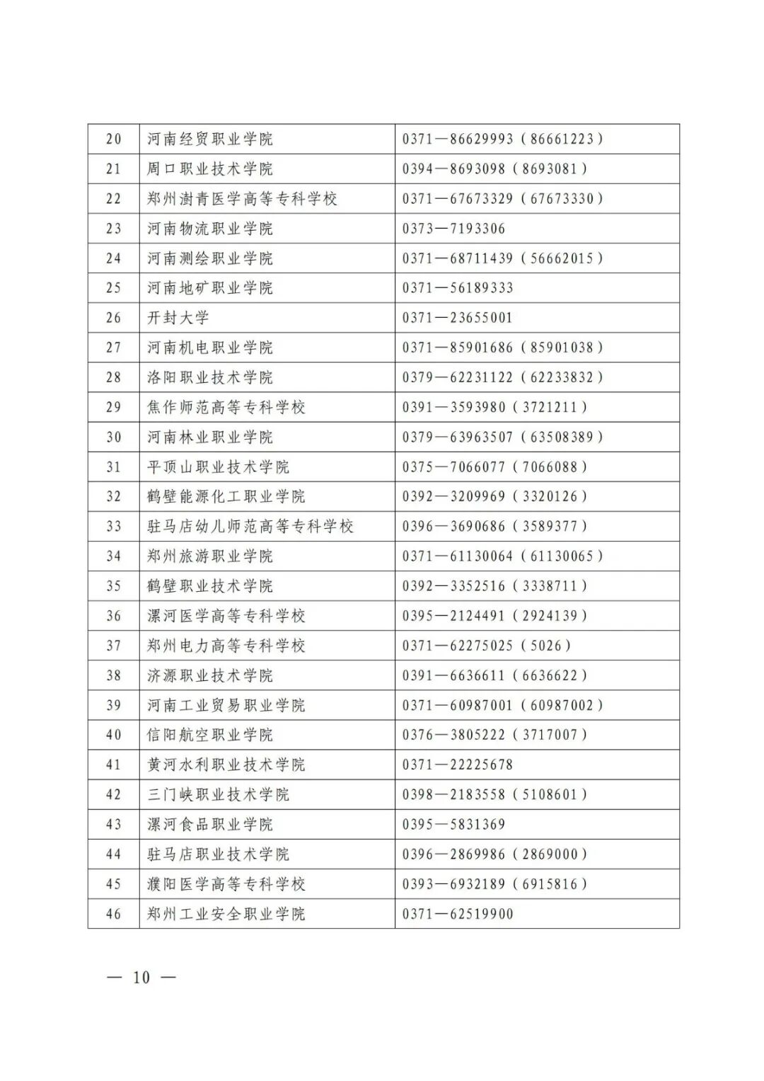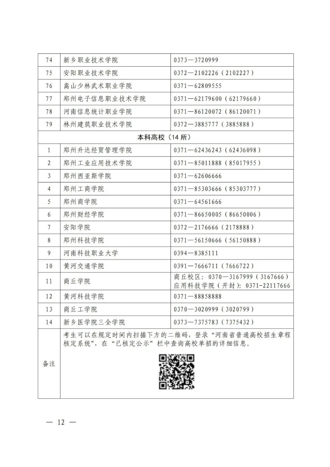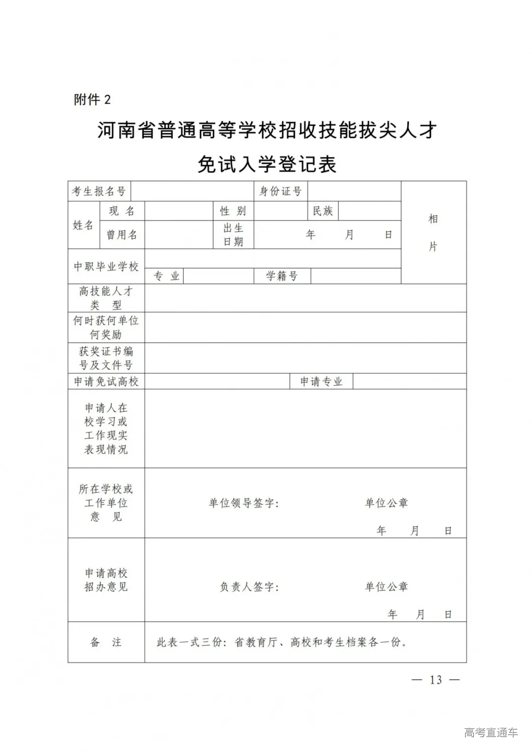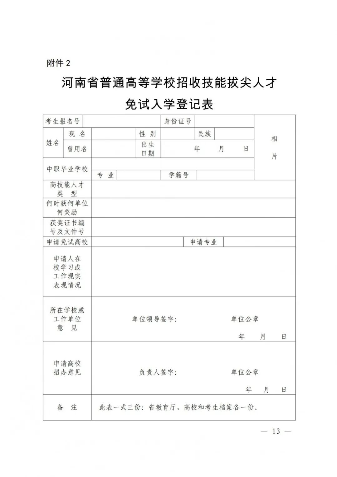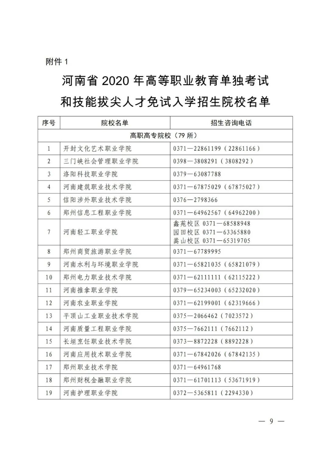 各省辖市、济源示范区、省直管县(市)教育局,各有关普通高等学校,各省属中等职业学校: 为全面贯彻全国、全省教育大会精神,加快推进高职院校分类考试,按照《国务院关于深化考试招生制度改革的实施意见》(国发﹝2014﹞35号)、《教育部关于应对新冠肺炎疫情 稳妥做好2020年全国普通高校招生工作的通知》(教电﹝2020﹞150号)、《教育部应对新冠肺炎疫情工作领导小组办公室关于做好2020年秋季学期教育教学和疫情防控工作的通知》(教体艺厅函﹝2020﹞22号)精神和《河南省教育厅办公室关于做好2020年高职单招准备工作的通知》(教办学〔2020〕98号)、《河南省新冠肺炎疫情防控指挥部教育系统工作专班办公室关于切实做好2020年秋季学期疫情防控工作的通知》(豫疫防教专办﹝2020﹞32号)要求,现就做好2020年河南省高等职业教育单独考试招生(以下简称“高职单招”)工作通知如下: 已通过2020年河南省普通高校招生考试报名和对口招收中等职业学校毕业生考试报名,未被统一高考、对口招生等其他类型的普通高校招生考试录取的考生。 (二)招生院校 河南省2020年高职单招和技能拔尖人才免试入学招生院校名单见附件1。 (三)招生专业 1.高校可在本校已批准开设的专业范围内自主确定2020年高职单招专业,对“一带一路”和我省支柱产业、新兴产业等紧缺人才的相关专业以及技术技能含量高的专业应优先安排。 2.支持郑州铁路职业技术学院面向国内和“一带一路”沿线国家紧缺人才相关专业开展本科后高级应用技术人才培养工作,报名工作由省招办另行安排。 3.医学、教育、公安、司法等国控专业以及医学美容技术(原医疗美容技术)、呼吸治疗技术专业不得安排高职单招。 (四)招生计划 高校在2020年本校专科招生总计划内统筹安排高职单招和统一高考、对口招生等类型的招生计划,单列高职单招计划,分专业招生计划由高校根据专业培养能力自主确定。2020年高职单招计划和分专业招生计划要在招生章程中公布,并须明确出现多人分数并列超计划无法全部录取时的录取规则。所有单招计划编制、调整须通过教育部招生来源计划管理系统进行,不得擅自超计划招生、超计划录取。 (五)志愿填报 考生应于2020年9月15日9时至9月17日18时登录“河南省普通高校招生考试服务平台”(http://pzwb.heao.gov.cn)进行网上志愿填报。考生须在规定的时间内填报一所高校志愿,并可以进行不超过两次的志愿修改,以网上最后一次保存的志愿为准。填报时间截止后将无法补报和更改,提醒广大考生按时认真填报志愿。 (六)考试录取 高职单招考试录取时间定为2020年9月20日至9月30日。高校须在规定时间内按照国家教育考试和疫情常态化防控要求,分专业、分时段、多批次、小规模自主组织考试、录取工作,全程封闭考试管理,到后即考、考后即离,减少人员聚集、停留。高校原则上在本校校区内开设考场。 1.对高中毕业生,高校原则上依据高中学业水平考试(或部分科目)原始成绩进行录取,确有专业培养需要的可组织职业适应性测试,根据高中学业水平考试(或部分科目)原始成绩和职业适应性测试成绩进行录取。省招办负责向高校提供高中学业水平考试原始成绩。对中职毕业生和社会考生,高校原则上不再组织文化知识考试,只组织职业技能测试并依据测试成绩进行录取。对参加统一高考和对口招生未录取的考生,可将其考试成绩作为高职单招录取依据。高校要在招生章程中明确本校录取规则并提前向社会公布。 2.高校须在规定时间内将拟录取考生名单及考生成绩在本校官网按要求公示后,于9月29日9:00至9月30日18:00通过“河南省特殊类型招生数据报送系统”上传省招办办理录取手续,按照《教育部办公厅 国家邮政局办公室关于进一步做好2020年高校录取通知书寄递工作的通知》(教学厅函〔2020〕23号)要求,将录取通知书及时、准确寄送考生本人。 对于获得由教育部主办或联办的全国职业院校技能大赛三等奖及以上奖项或由省级教育行政部门主办或联办的省级职业院校技能大赛一等奖的中职毕业生,和具有高级工或技师资格(或相当职业资格)、获得县级劳动模范先进个人以上称号的在职在岗中职毕业生,可免试录取进入高校专科阶段学习。 (二)免试录取程序 1.考生本人在规定时间内填写《河南省普通高等学校招收技能拔尖人才免试入学登记表》,提出免试入学申请(详见附件2)。由考生所在学校负责考生获奖情况的确认。 2.考生所在学校将上述登记表及相关材料以可靠方式送考生申请免试入学的高校,由高校进行相关资格审查和公示,并将公示后的名单及《河南省普通高等学校招收技能拔尖人才免试入学登记表》、考生身份证复印件、技能竞赛获奖证书复印件报省教育厅职业教育与成人教育处进行备案。 3.核实审定的拟录取名单由高校在本校官方网站上进行公示。公示无异议者,由省招办办理录取手续,高校颁发录取通知书。被免试录取的考生,不再具有参加其他类型的普通高校招生考试的资格。 (二)考生查询。考生可通过登陆“河南省普通高校招生章程核定系统”查询了解我省高职单招政策和高校的单招章程,也可通过高校官方网站或拨打高校招生咨询电话进行咨询,切勿通过非正规渠道查询了解高职单招信息,以防被误导、上当受骗。 (二)做好疫情防控。各高