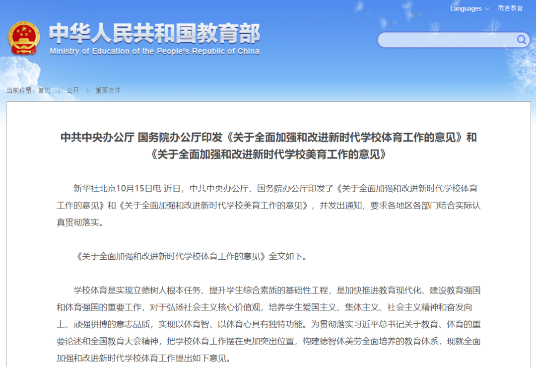 10月15日,中共中央办公厅、国务院办公厅印发了《关于全面加强和改进新时代学校体育工作的意见》和《关于全面加强和改进新时代学校美育工作的意见》,并发出通知,要求各地区各部门结合实际认真贯彻落实。