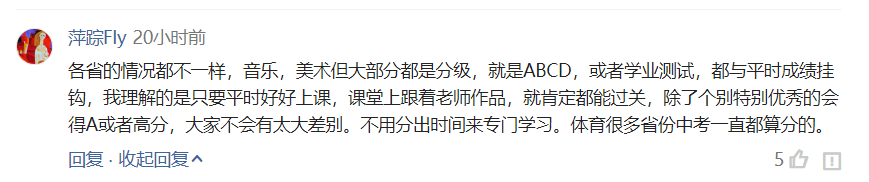 音乐、美术科目考试方式由各州市自行确定,九年级下学期开考。考试总分均为100分,每个科目考试成绩达到优秀、良好、合格者,分别按照20、15、10 分计入高中阶段学校招生录取总成绩,不合格者为零分。