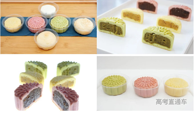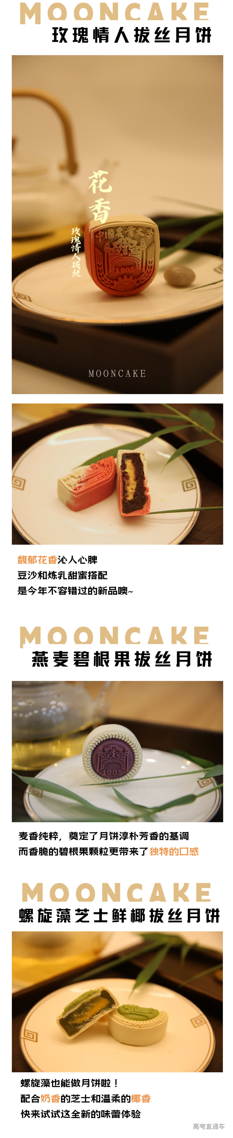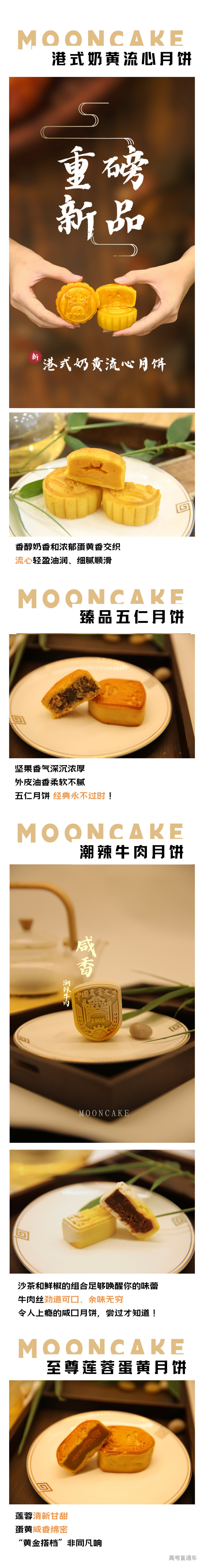 口味:五仁、枣泥、抹茶、金沙奶黄、红酒蔓越莓、蛋黄肉松、莲蓉、玫瑰豆沙、椰蓉、紫薯、椒盐苏籽等