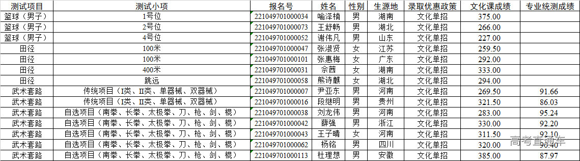 根据教育部有关文件精神及《武汉理工大学2022年高水平运动队招生简章》相关规定,参照国家体育总局组织的单独招生文化课考试及武术项目专业测试成绩,结合我校高水平运动队建队需要,按照择优录取、宁缺勿滥的原则,经学校研究决定,确定我校一级(含)以上运动员单独招生文化课考试合格分数线为220分,武术套路自选项目专业测试合格分数线为87分,传统项目专业测试合格分数线为86分,拟录取名单见附件。