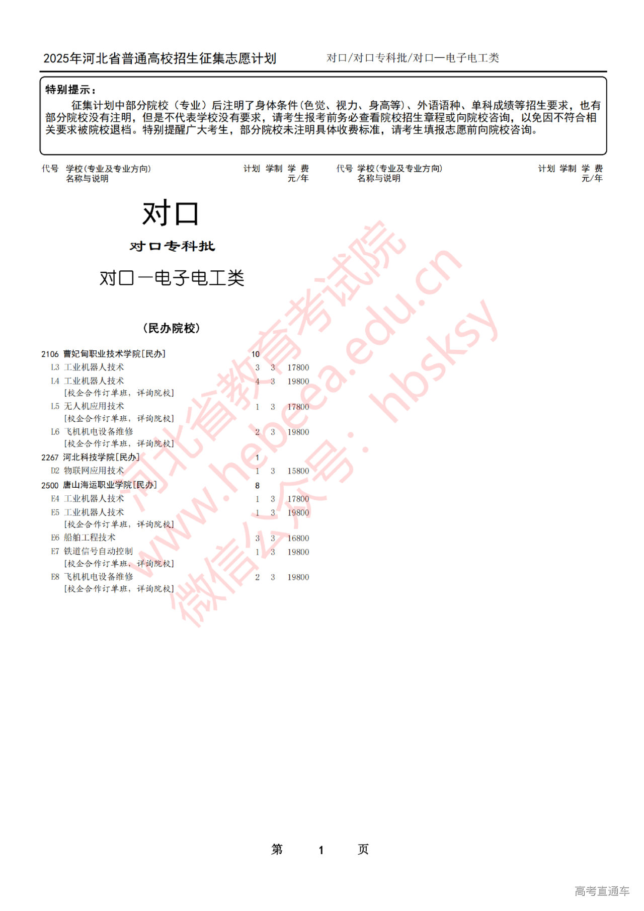 河北2025年对口专科批对口—电子电工类征集志愿计划