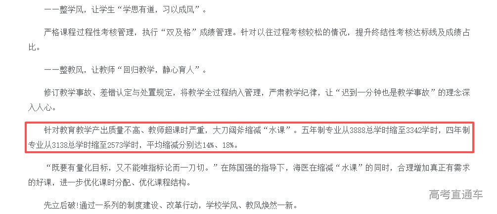 一组案例为证:北京信息科技大学本科专业最多降低30学分,力争实现教学“0注水”、门门是“金课”;复旦大学启动教育教学改革3.0版,减少15-20个本科必修学分,裁减重复内容,达到挤压“水课”的目标;海南医科大学大刀阔斧缩减“水课”,四年制专业从3138总学时缩至2573学时,平均课时缩减近五分之一……