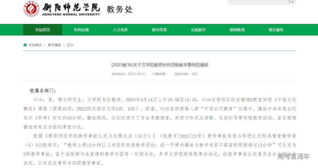 有的“水课”,美其名曰“艺术鉴赏”,实则放电影拖时间。今年4月,衡阳师范学院文学院一名教师在上课期间播放中央电视台纪录片《科举》时长约45分钟,全程仅进行学生考勤核查,未进行知识点讲解、互动引导等有效教学活动,学校通报此次事件为四级教学事故。
