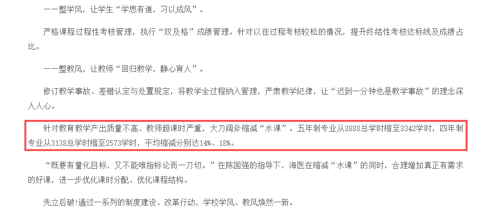 这两年,海南医科大学以“破天荒”的精神气魄,修订或制定了77项制度,掀起了一场史无前例的守正创新改革。缩减“水课”,是改革的重要一环。在首位院士校长陈国强的指导下,海医针对教育教学产出质量不高、教师超课时严重的问题,大刀阔斧缩减“水课”,压缩学时——五年制专业从3888总学时缩至3342学时,四年制专业从3138总学时缩至2573学时,平均缩减分别达14%、18%。与此同时,海医合理增加真正有需求的好课,进一步优化课时分配和课程结构,真正做到本科教学“既有课程学时的量化目标,又不唯指标论而一刀切。”