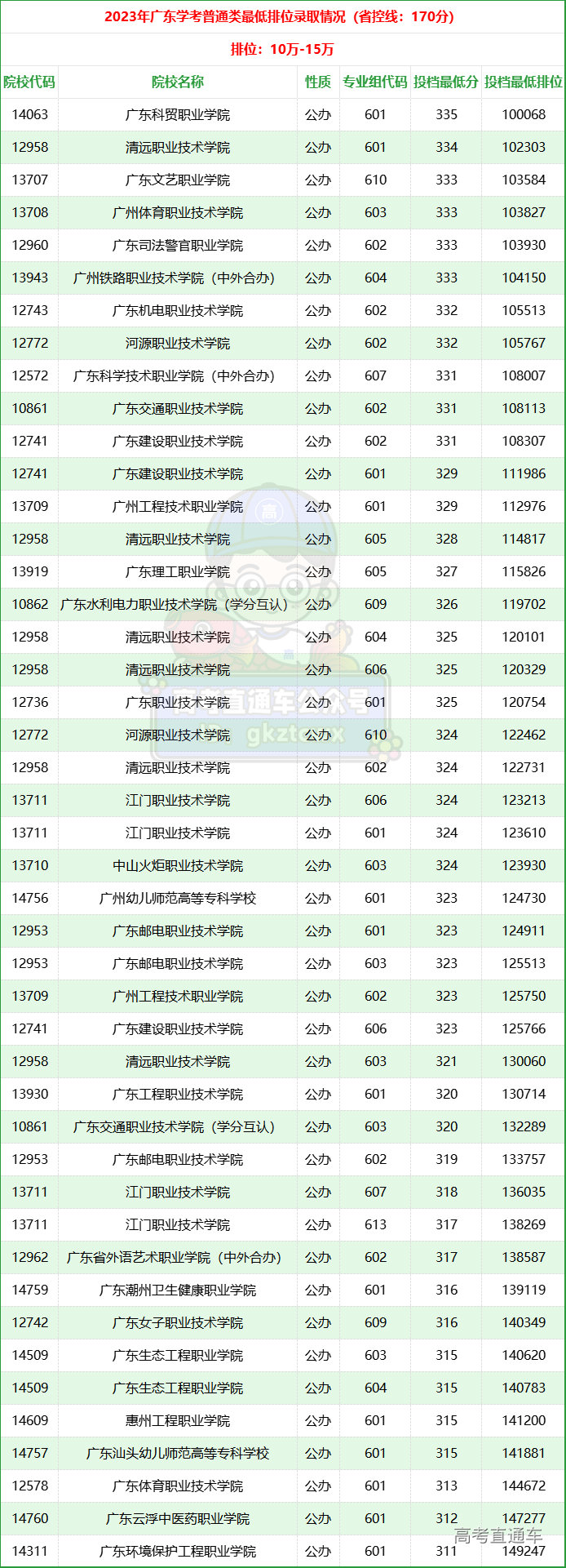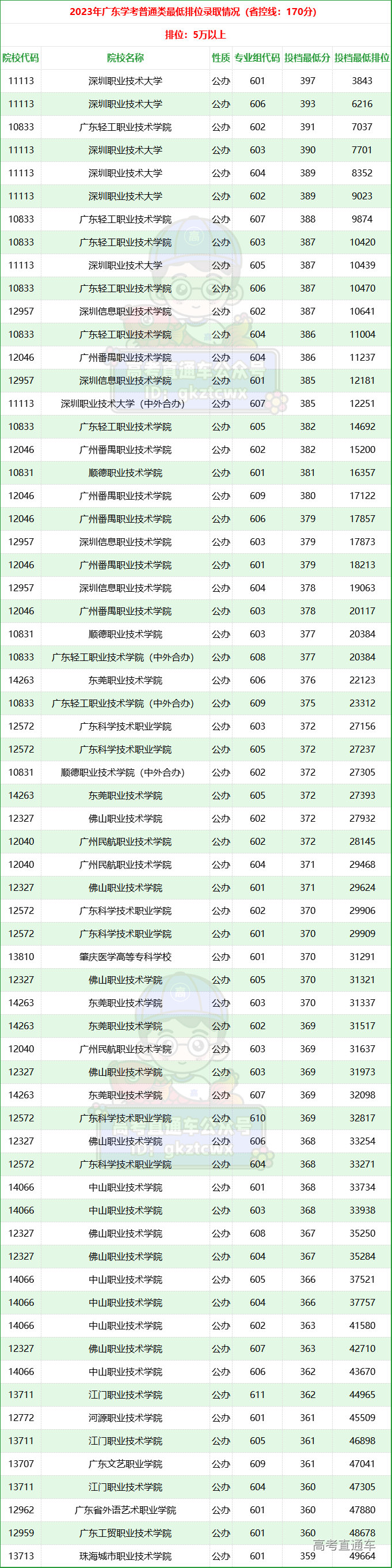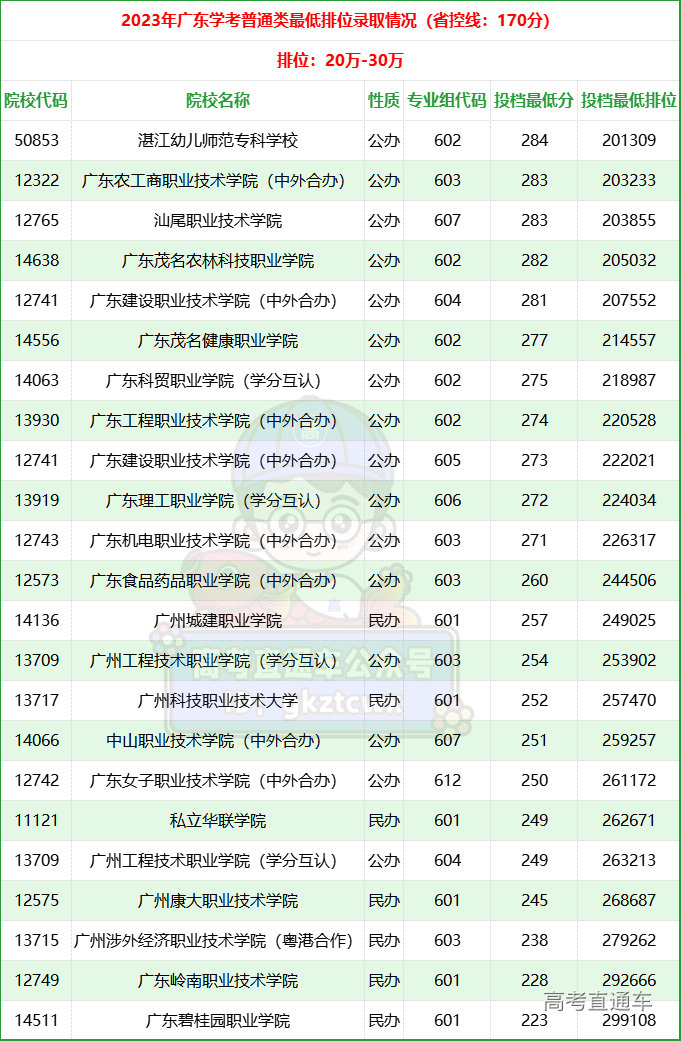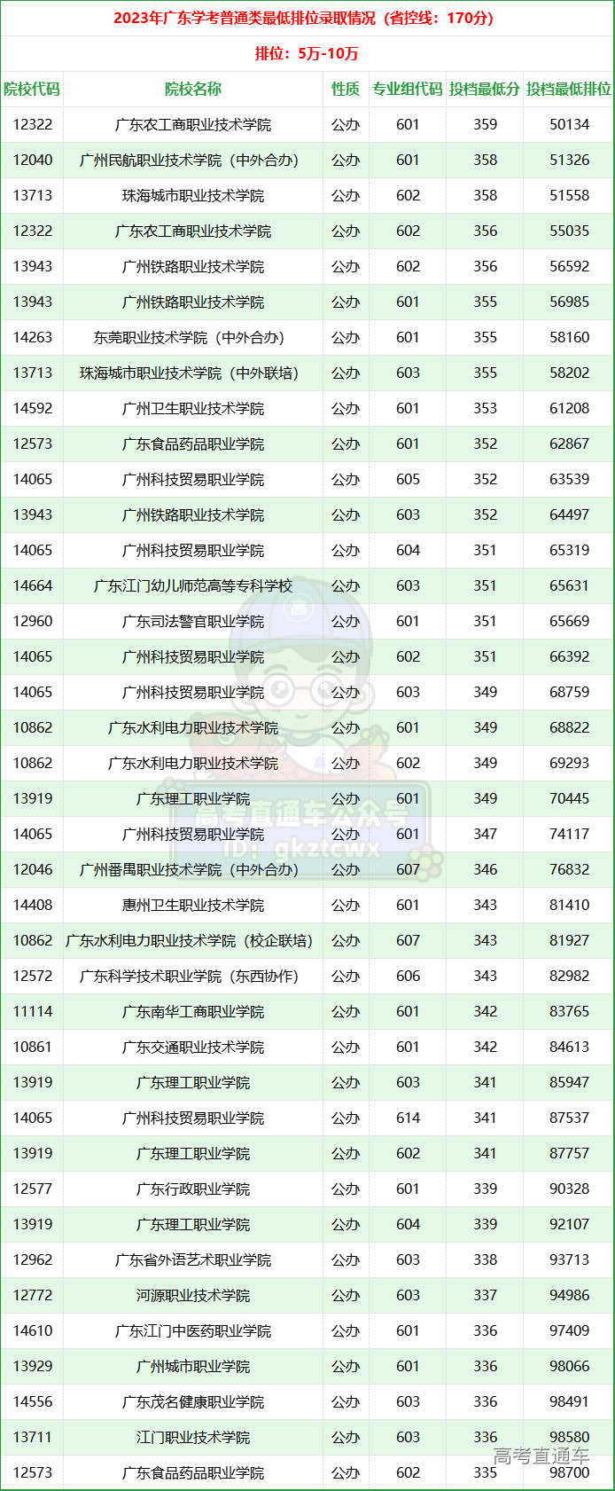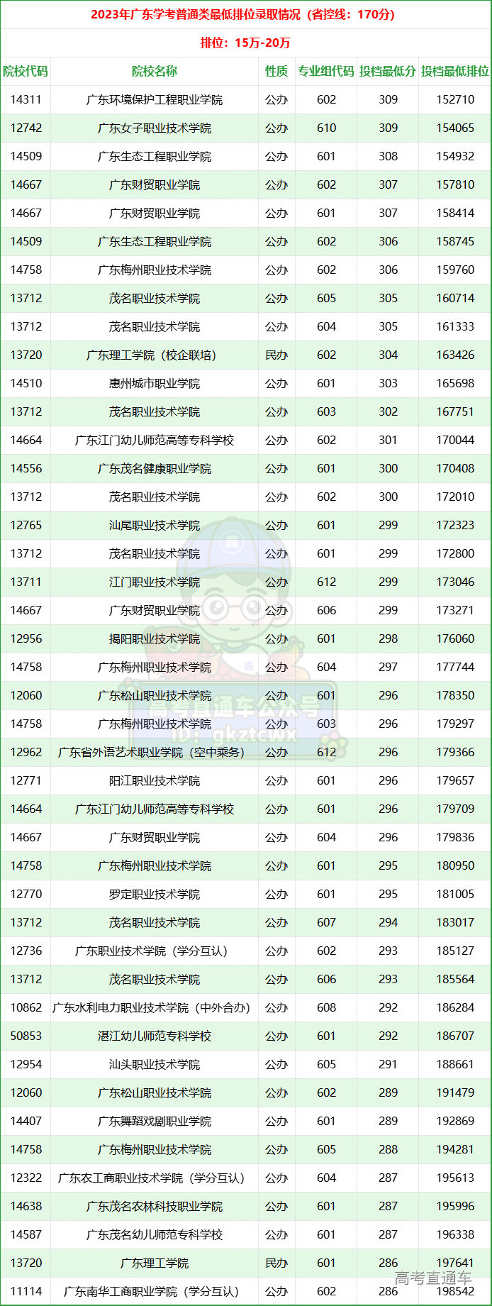 有同学问,那学考排名在95000之后的是不是没有机会上公办了,其实不然,每年都会有部分同学因院校、专业等原因而放弃填报志愿,那排位稍微靠后的同学还是有机会捡漏到相对冷门的院校或专业的。以2023年为例,广东茂名健康职业学院、广东茂名农林科技职业学院、汕尾职业技术学院等公办院校低学费的专业组,就录取到了20-21万多名。