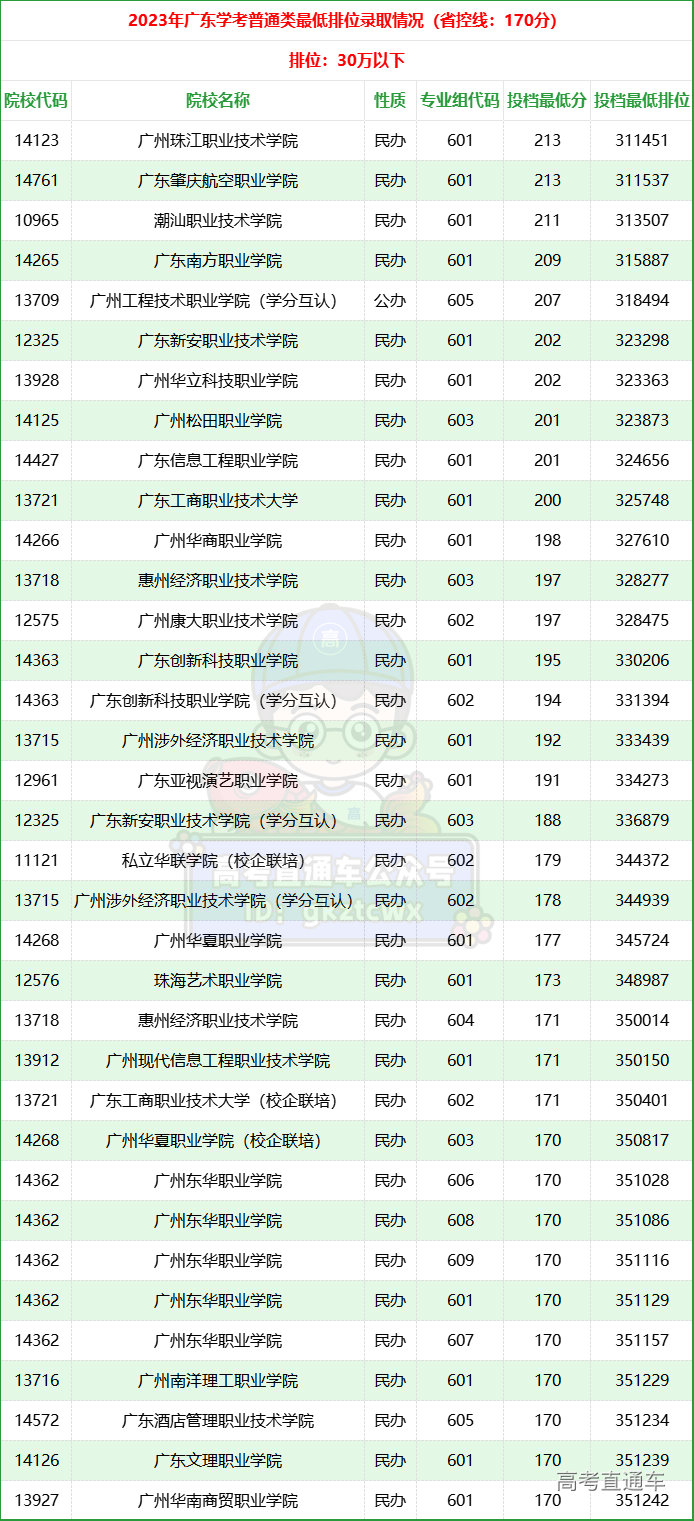 从目前统计的成绩来看,无论哪个分数,排位对比去年都是上涨的,同分排位变化非常大。同学们如果直接照搬往年分数、排位填报,无疑是“自杀式”填报,很有可能会导致志愿不合理,从而会出现落榜风险。 那参考往年的院校专业组最低排位可以吗?可以,但是必须要结合招生计划变化来考虑。今年比起往年是否扩招、缩招,也是我们考虑学校最低录取排位是否会浮动的重要因素。 举个例子:同样是考301分,今年的排位是21.9万,相较去年排位下降了近5万名,相当于去年275分的排位,分数大大缩水。也就是说,如果你还是按照去年301分去选择可报院校,今年未必能被录取。建议重点参考去年275分的可报院校,考虑到今年公办整体缩招,分数还要往下降低一些去择校。 2023各院校专业组最低录取排位情况如下,同学们可以参考一下。从公办的投档情况来看,学费较低的专业组投档排位是21.4万。2023年公办院校专业组投档排位最低仅虽为31.8万,但该专业组来自广州工程技术职业学院605专业组,开设的招生专业为旅游管理,属于与英国密德萨斯大学的学分互认项目,专业的学费为每学年19750元,费用较为昂贵。