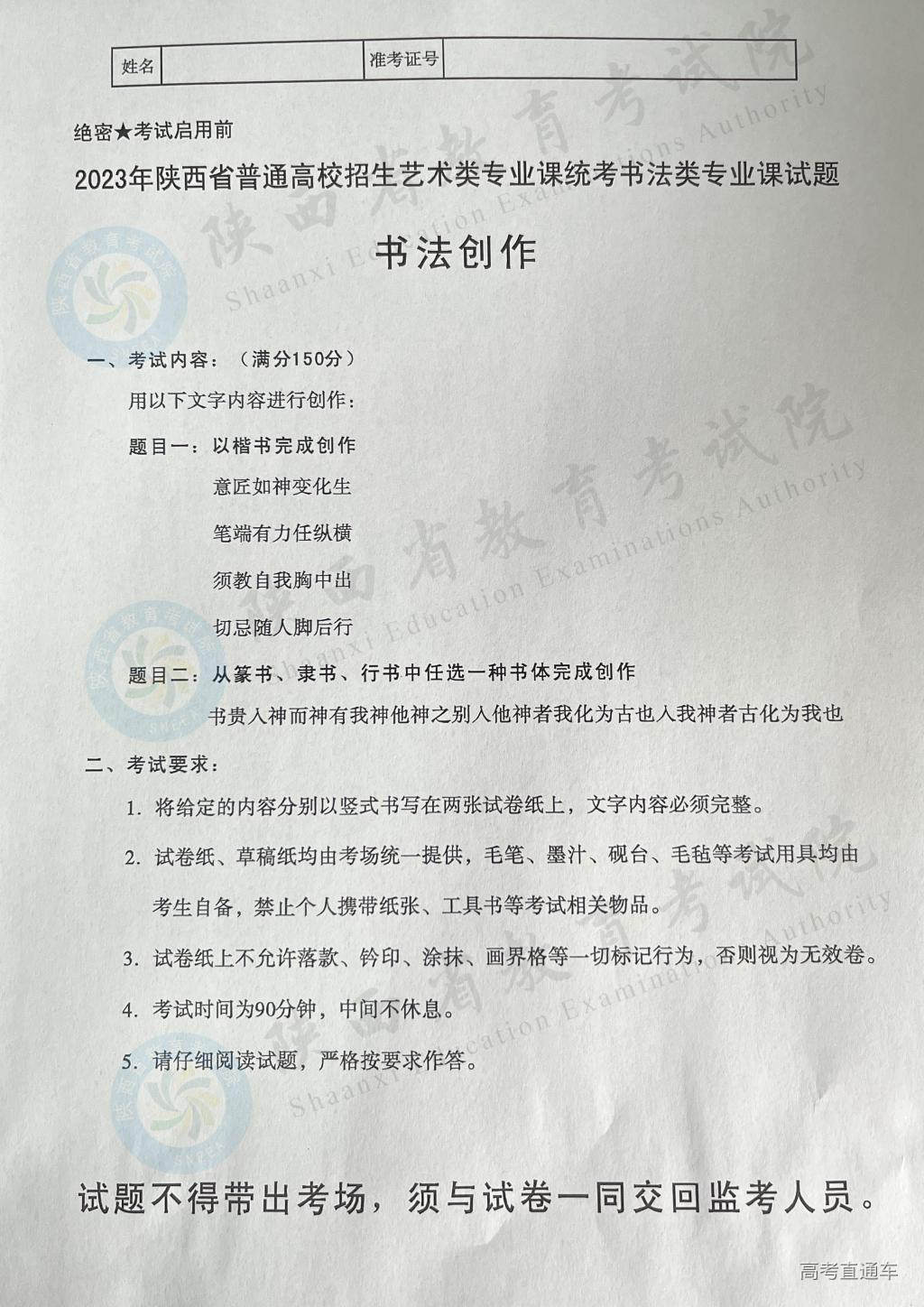 陕西2023艺术类专业课统考美术类专业课试题(书法创作)