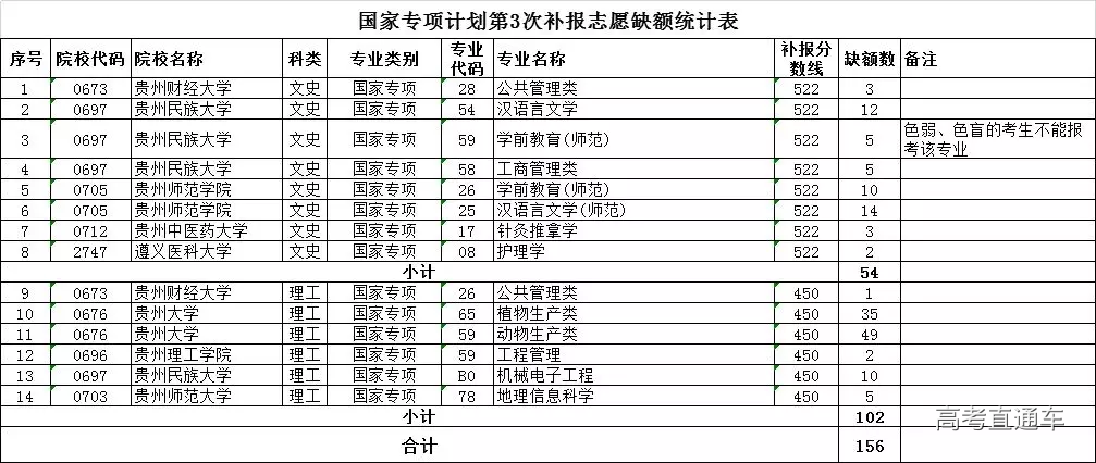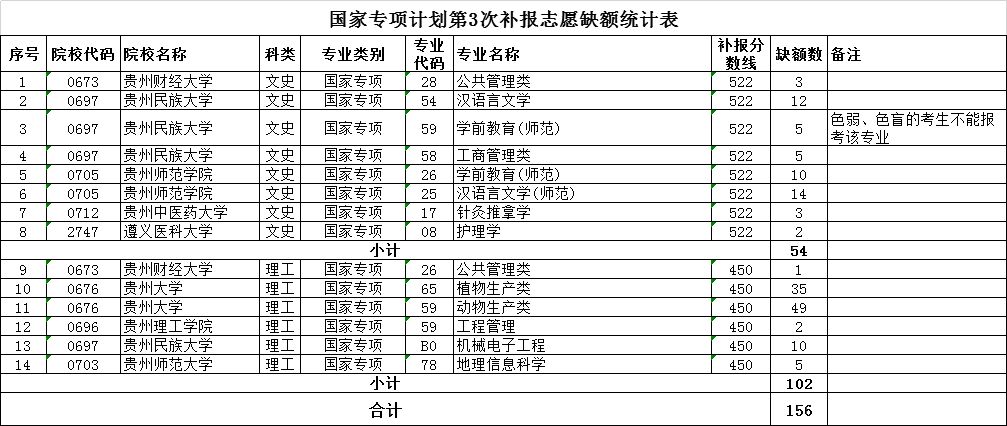 二、国家专项计划报考资格审查合格且分数达到要求的未被录取考生,均可根据附表公布的缺额情况补报志愿。考生补报时请仔细查阅《贵州省2019年高考高校招生专业目录》和院校招生章程了解各院校招生专业的特殊要求。