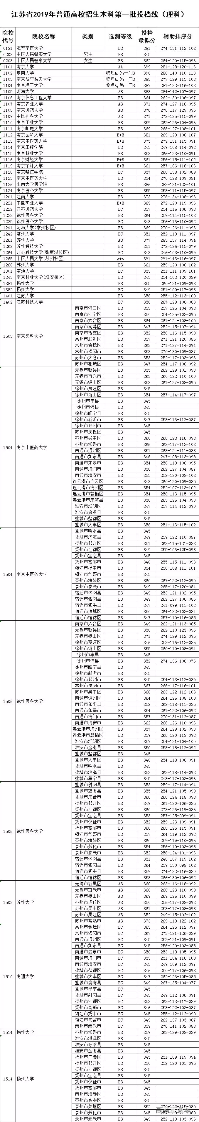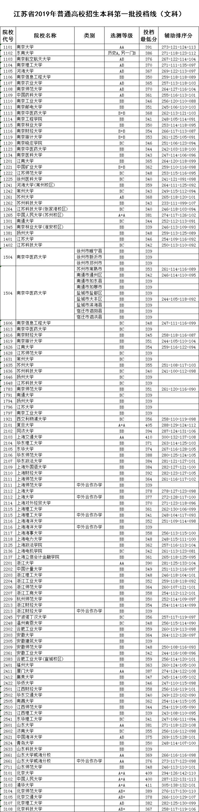 今天(7月15日),江苏省教育考试院公布了2019江苏高招一批次本一院校文理科投档分数线。 今年,由于江苏考生高分段人数较去年有所增加,清华北大、交大复旦、南大东大等院校投档线也水涨船高。北上广苏等地院校报考人数依旧居高不下。据统计,目前,本一批次投档文科类院校平行志愿计划满足率达96.82%,仅有29所学校没有录满,理科类投档计划满足率达98.91%,有20所院校需要进入征求平行志愿再次录取,其他院校本一批次几乎全部录满。 今年江苏高招清华大学投档线理科最低421分,文科分411分(去年理科391分、文科388分);北京大学投档线理科分424分,文科409分,(去年理科388分、文科383分)。南京大学投档理科最低线399分,文科391分(去年理科391分、文科388分);东南大学理科398分,文科386分(去年理科388分、文科383分)。 据江苏省教育考试院发布的统计数据显示,今年江苏本一批次333所院校共计划招生72625人,其中文科类招生计划14405人;理科类招生计划58220人。该批次重点高校众多,高分考生集中,受关注程度很高。本一批次招生计划情况也相对复杂,涉及自主招生、高校专项计划、综合评价录取(B类院校)、高水平艺术团、高水平运动队等招生类型。从实际的投档情况看,今年本一批次的投档主要有以下几个特点: 省内外增加计划的高校数量较多。由于江苏省生源质量较好,在全国高校中有较高的认可度,有不少名校在投档前增加计划参与批量投档,还有相当数量的省内外高校在投档后将追加计划录取进档考生。 平行志愿一次性投档计划满足率高。参加批量投档的文科类院校一次性投档计划满足率为96.82%,投档后生源不足的院校仅有29所;参加批量投档的理科类院校一次性投档计划满足率达98.91%,投档后生源不足的院校仅为20所。 院校、分数和等级的匹配程度较高。全国重点高校、热门高校和大城市高校的投档情况大多呈现高等级、高分数的态势。省内外重点高校以及热门专业较多、办学特色较为明显的高校生源都很充足,表明我省考生填报志愿时比较注重高校的综合实力、专业排名、就业前景等因素。 考生报考院校地域去向较为均衡,没有出现大面积的生源缺额情况。从省内高校看,南京地区由于高校数量多、办学水平相对较高等因素,受考生欢迎程度相对较高;其余地区均有少数高校生源不足。 经批准,江苏省从2016年起继续开展农村订单定向医学生免费培养工作,为农村基层医疗机构培养适宜医学人才,只招收户籍等符合报考条件的应届高中毕业生。从投档情况看,该类招生计划文、理类仍有一定缺额,说明定向地区考生的报考意向不足。 7月12日晚,我省对自主招生、高校专项计划、综合评价录取(B类院校)等特殊类型招生的入选考生进行了投档。7月15日起,我省本一批次的录取工作全面展开,省教育考试院将陆续发布考生的录取结果,考生可通过省教育考试院门户网站、“江苏招生考试”微信公众号或江苏招考APP及时查询。 7月17日,省教育考试院将公布本一批次未完成招生计划的院校、专业及人数,未被录取且符合填报条件的考生须在7月18日9:00-15:00自行上网填报本批次征求平行院校志愿。 7月19日,本一批次的录取工作将全部结束。