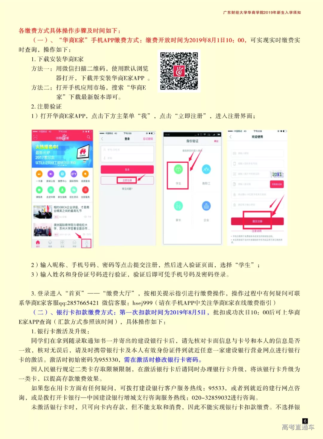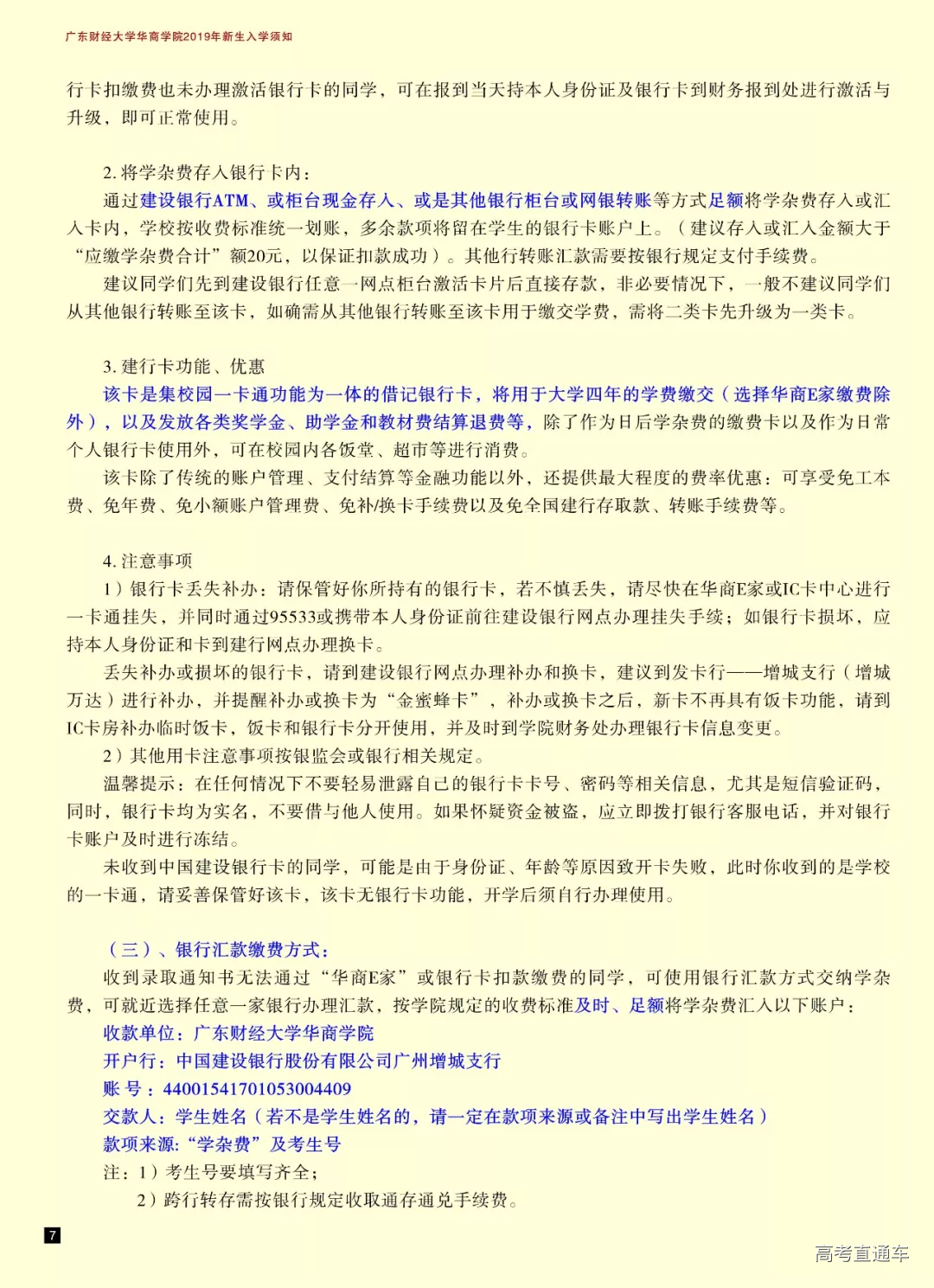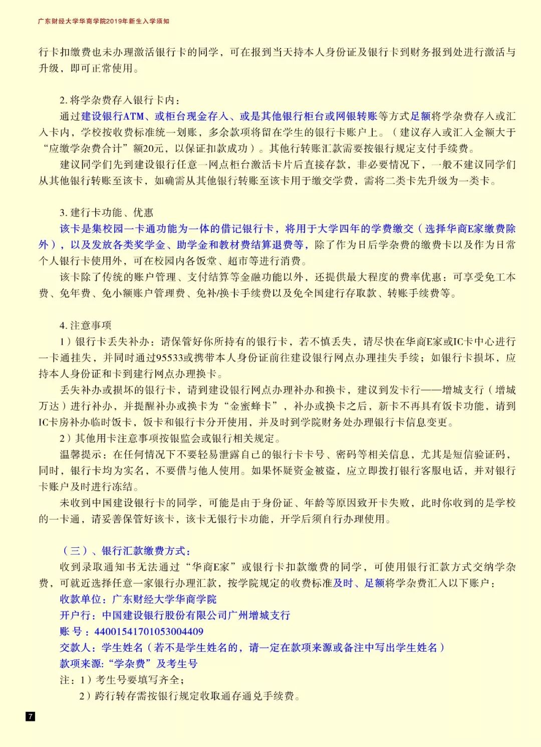 为方便部分同学选择银行卡缴费,学校随新生录取通知书附寄一张专属于新生本人实名登记的建设银行卡,激活和使用注意事项见入学须知的缴费部分内容。该银行卡集校园一卡通功能。